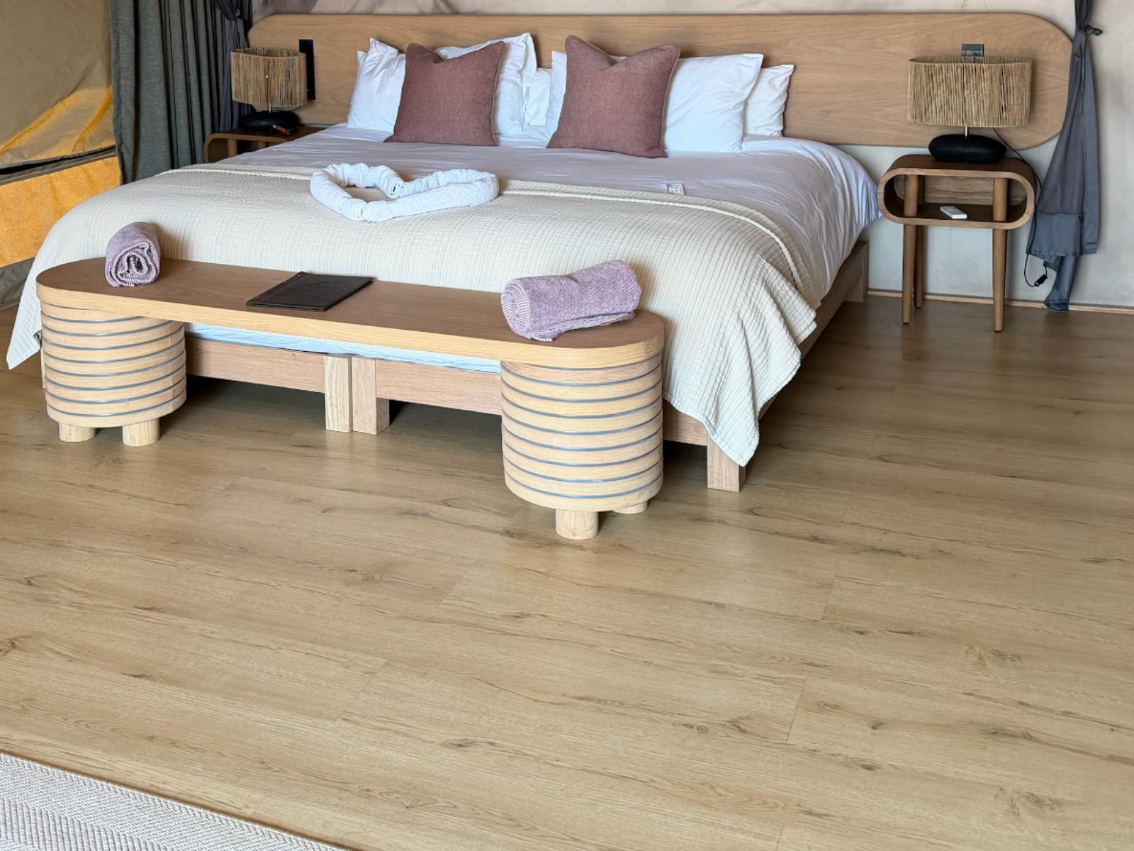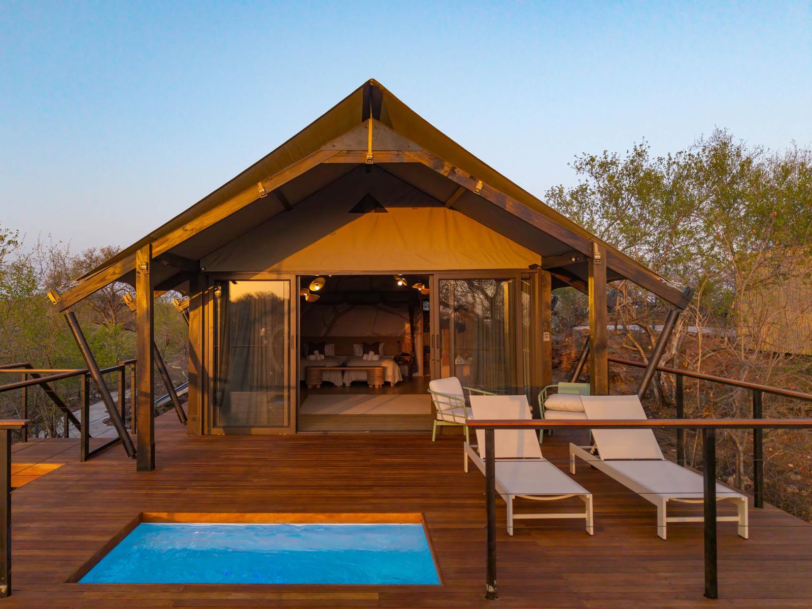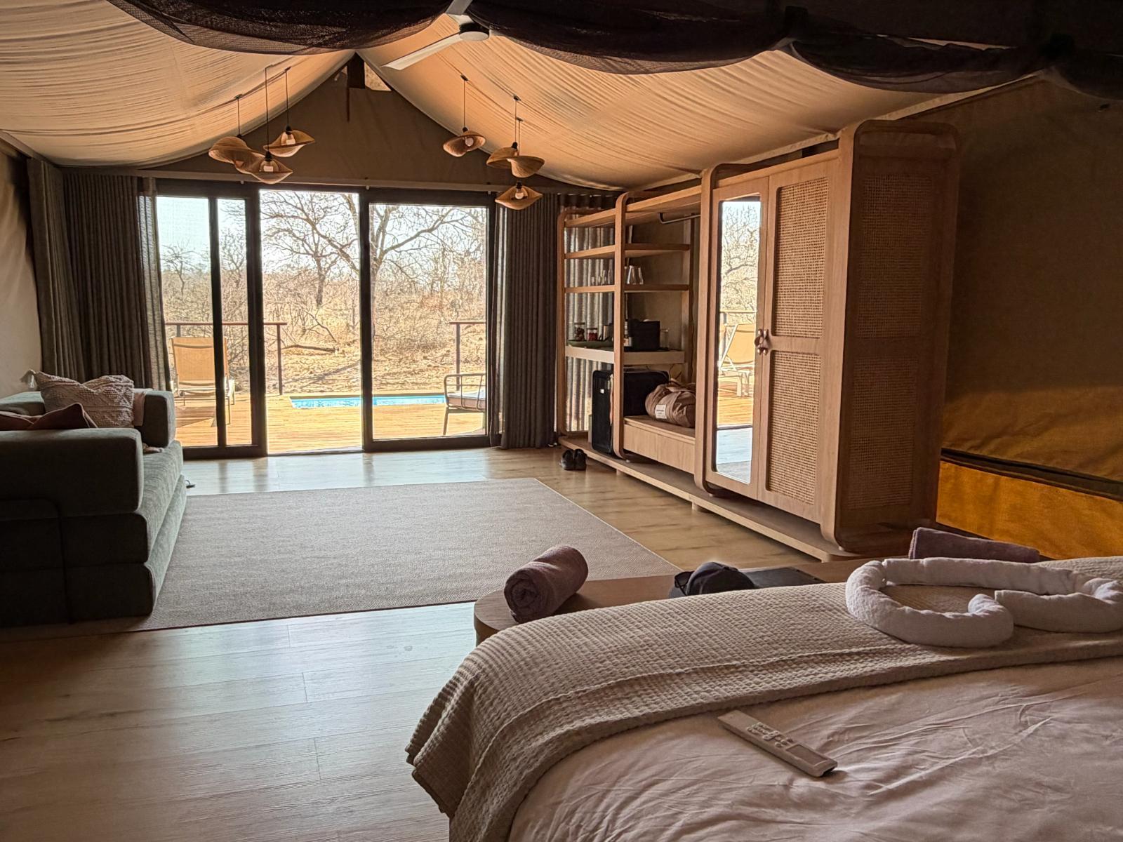 Each of the 9 Luxury Tented Suites were inspired by the trees indigenous to the Kruger area. The room is modern, spacious & calming with a super king bed (can split into 3/4 beds), a sofa bed, a private plunge pool & outdoor shower.