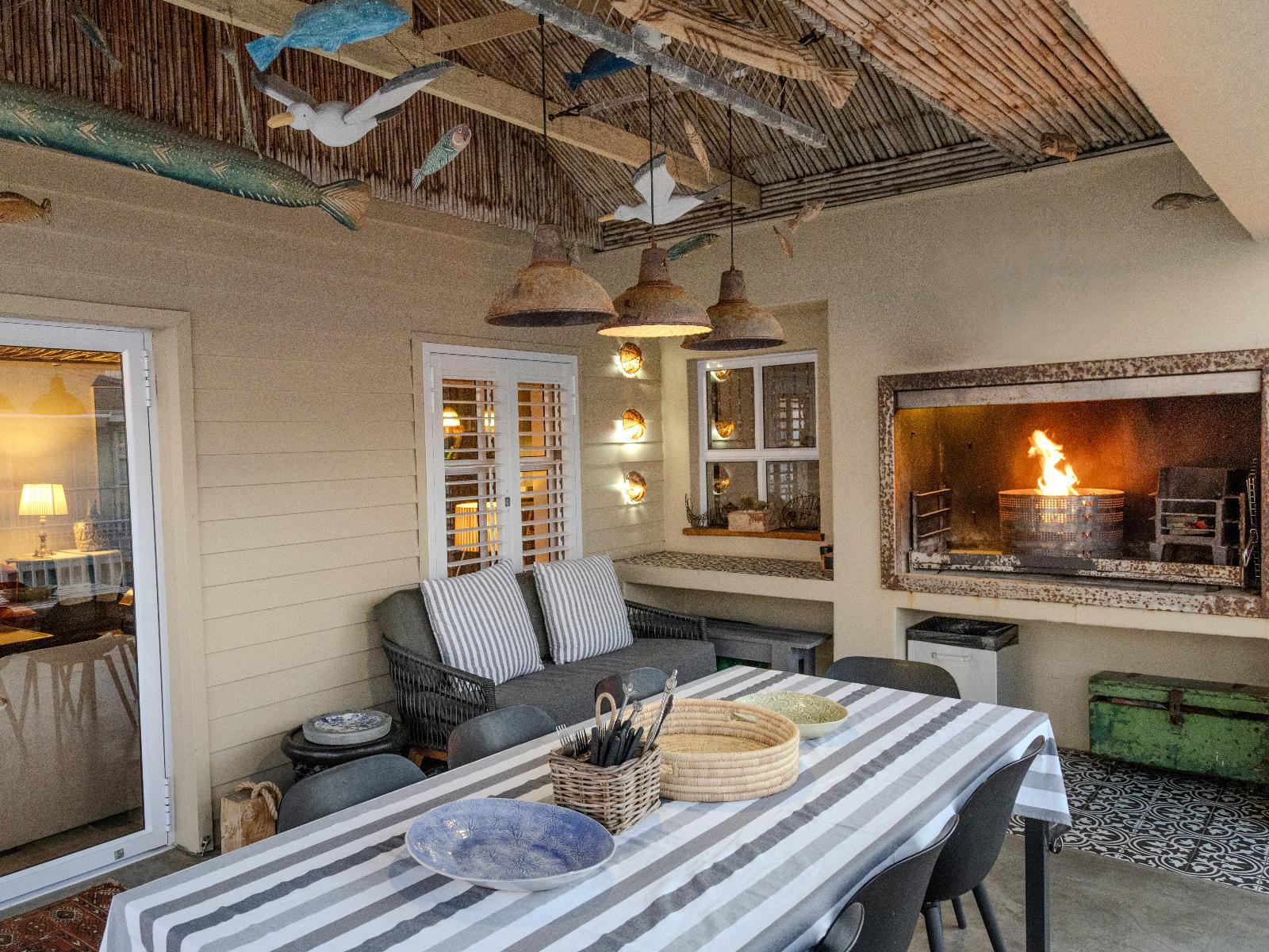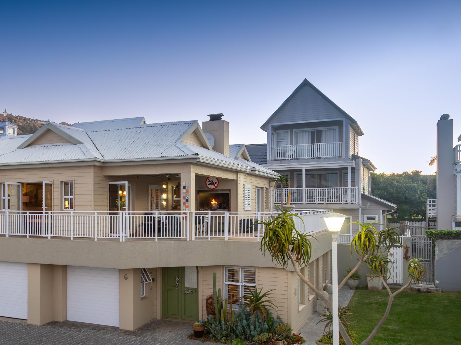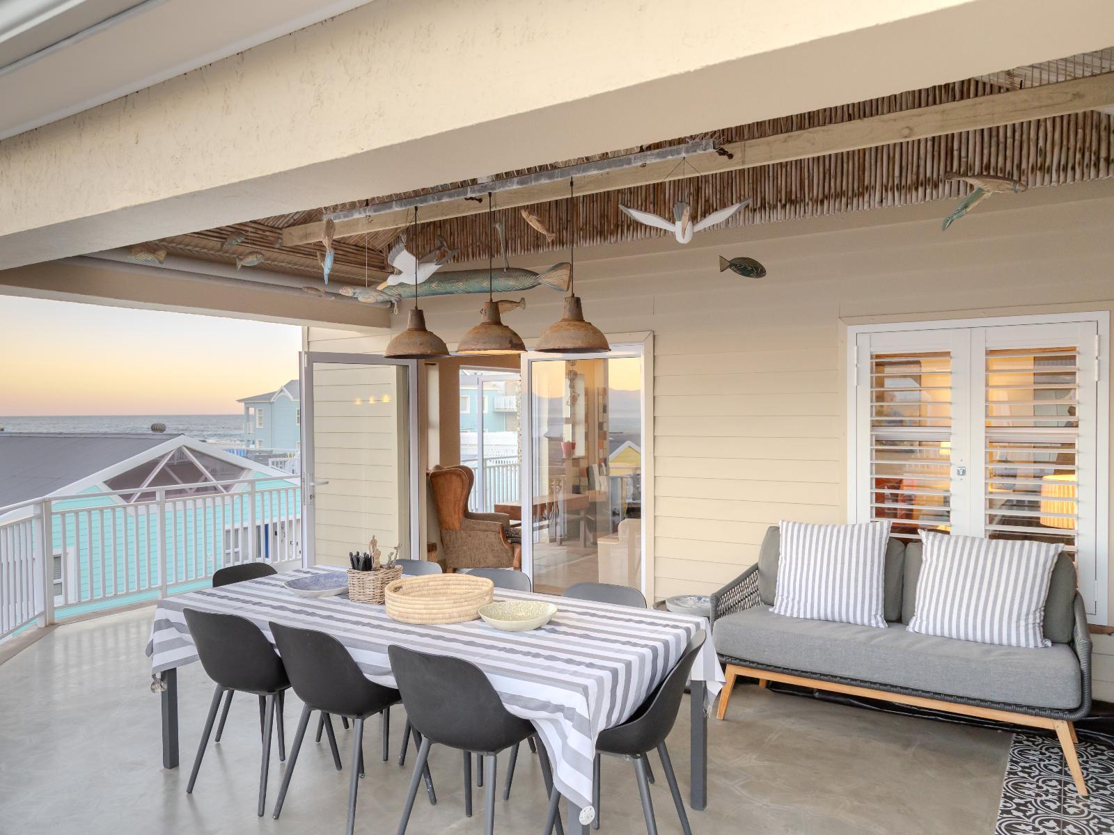 Luxury, uniquely decorated, fully equipped, self-catering beach house sleeps up to 8. The ground floor has 3 bedrooms, two with a queen size bed and one with 2 single beds plus 2 bathrooms and a living room *Steps lead to the first floor with the main bedroom, en-suite bathroom, open-plan kitchen, dining room and fireplace. Full sea view from the first floor. Huge balcony with 270° view with braaiplace and Weber. Dishwashing machine and safe parking with the unit Luxury accommodation is available for a maximum of 8 people and comfortably furnished for an enjoyable weekend or holiday. Entrance to the Village is controlled, and there is 24-hour security in the Village The beach house is situated approximately 30m from the sea and tidal pool with stunning views of the sea and surrounding Outeniqua mountains. Within walking distance of town and several restaurants