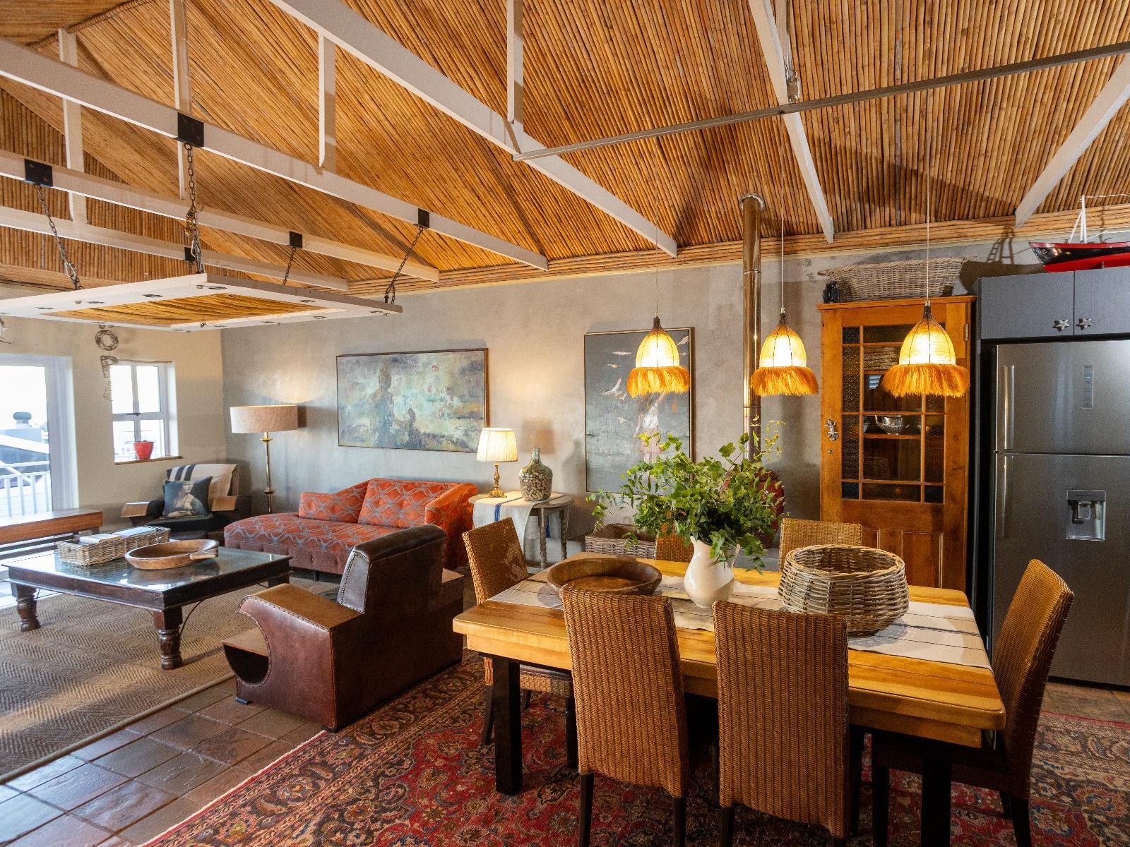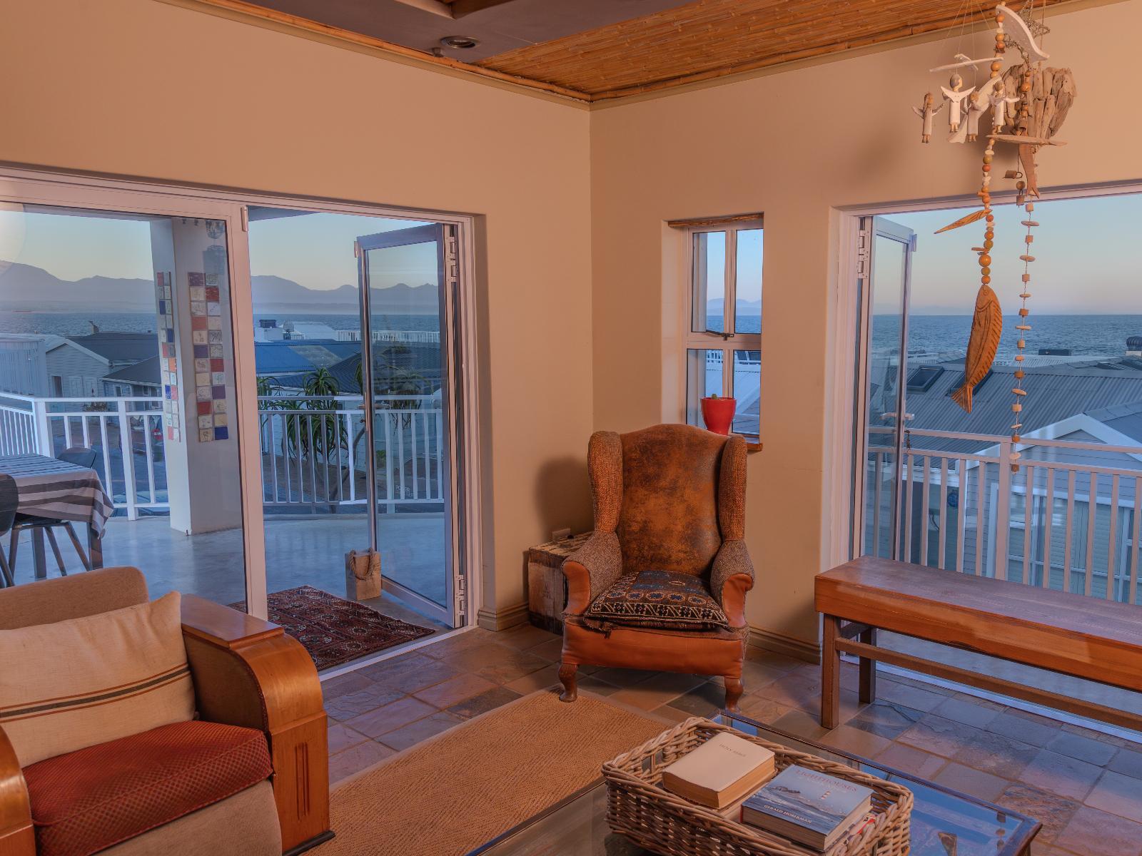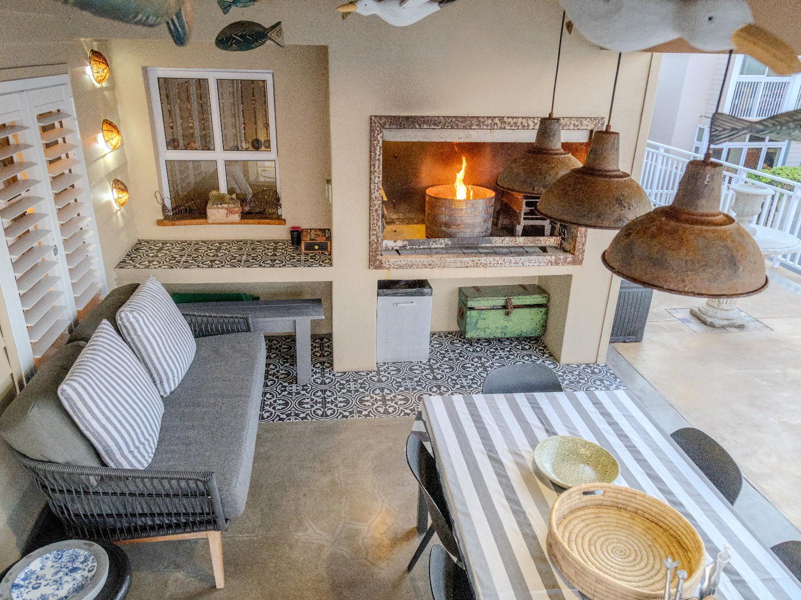 Luxury, uniquely decorated, fully equipped, self-catering beach house sleeps up to 8. The ground floor has 3 bedrooms, two with a queen size bed and one with 2 single beds plus 2 bathrooms and a living room *Steps lead to the first floor with the main bedroom, en-suite bathroom, open-plan kitchen, dining room and fireplace. Full sea view from the first floor. Huge balcony with 270° view with braaiplace and Weber. Dishwashing machine and safe parking with the unit Luxury accommodation is available for a maximum of 8 people and comfortably furnished for an enjoyable weekend or holiday. Entrance to the Village is controlled, and there is 24-hour security in the Village The beach house is situated approximately 30m from the sea and tidal pool with stunning views of the sea and surrounding Outeniqua mountains. Within walking distance of town and several restaurants