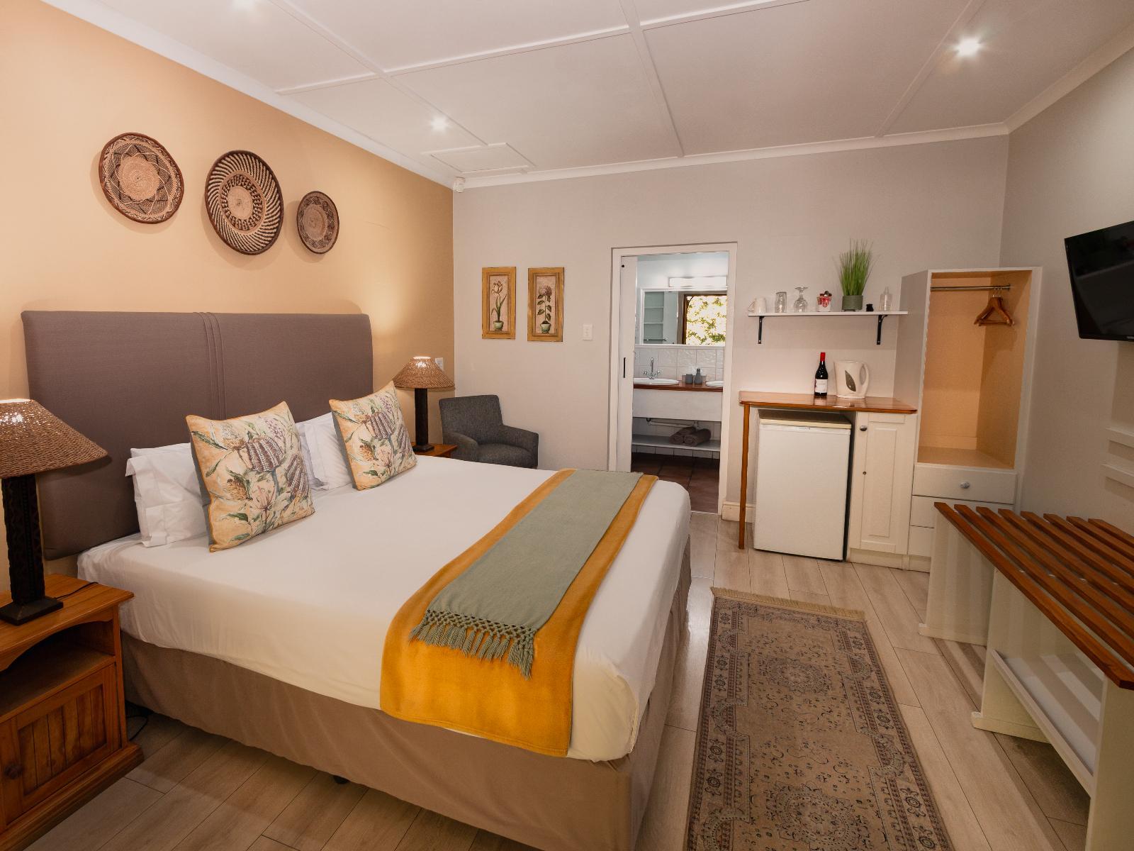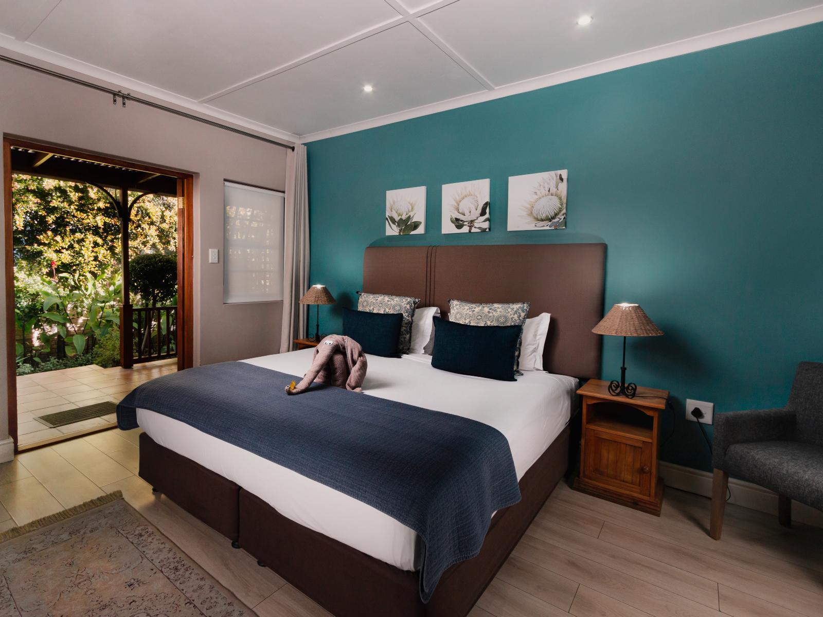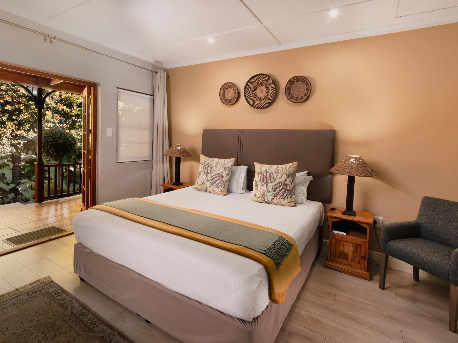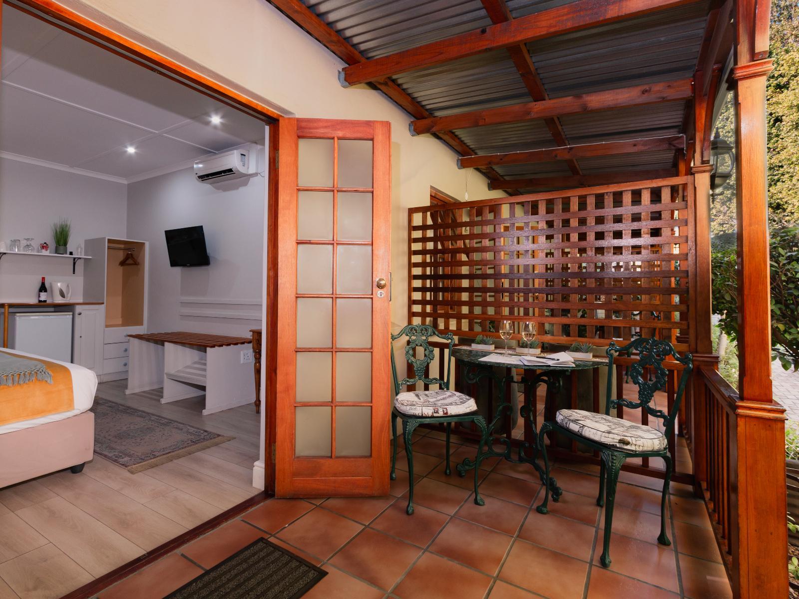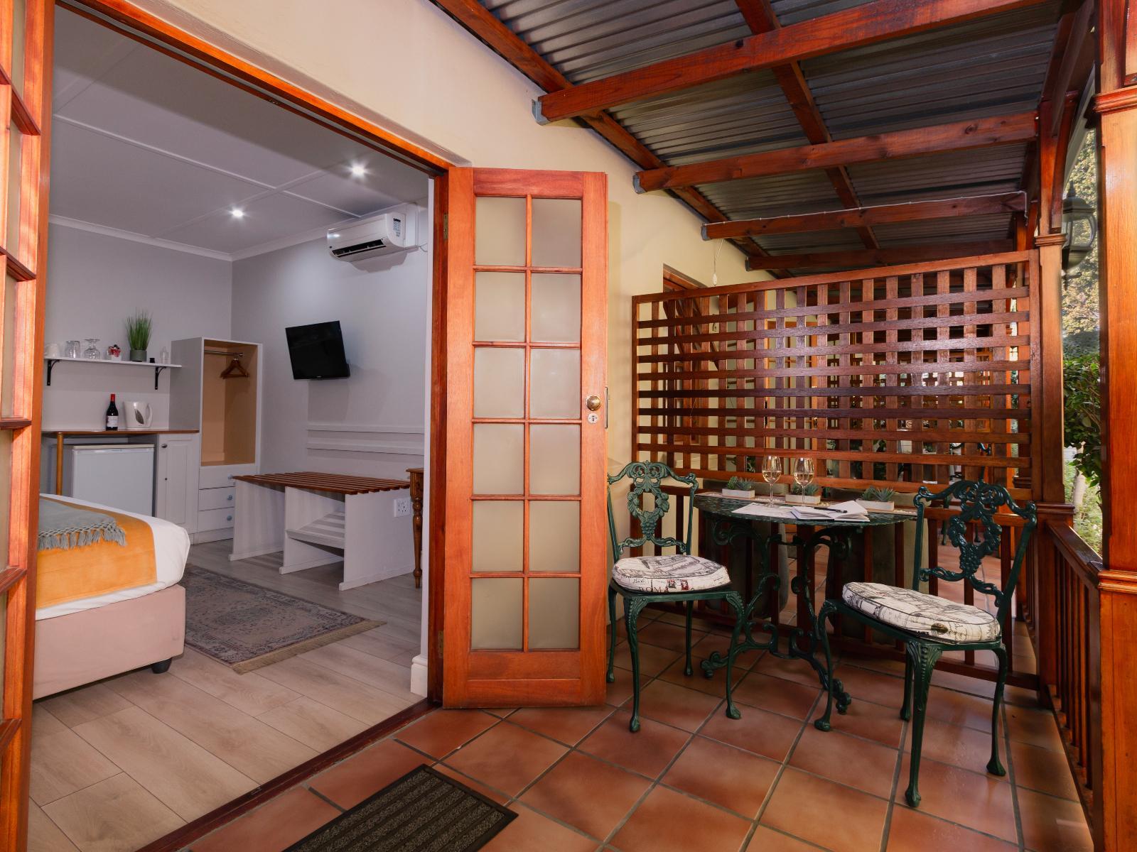The Stoep/Veranda Room has Extra Length King bed with a shower en-suite, twin basins, hairdryer, mini fridge, TV and air-conditioning. French doors open out from the room onto a private veranda with seating, overlooking a small garden.