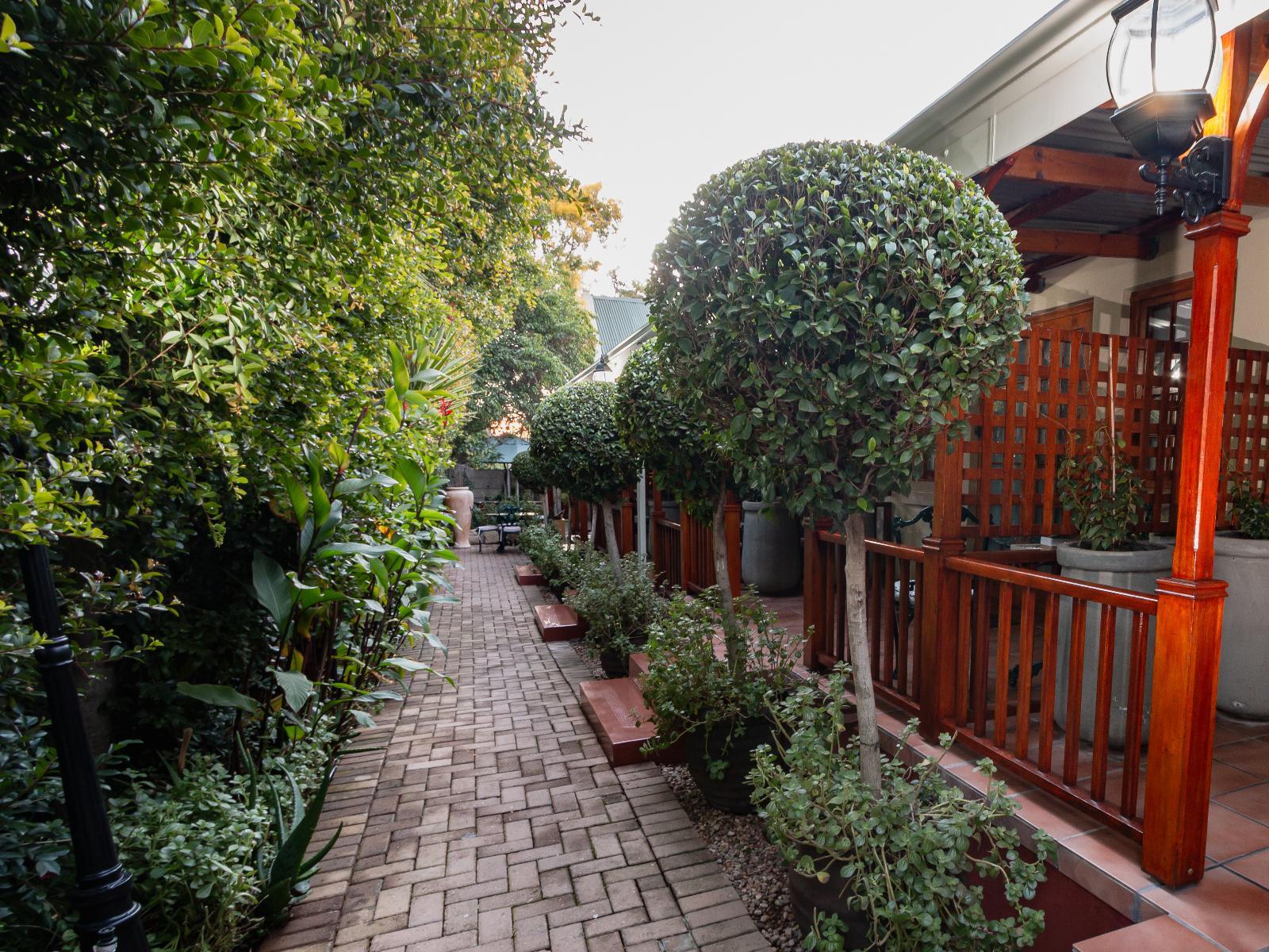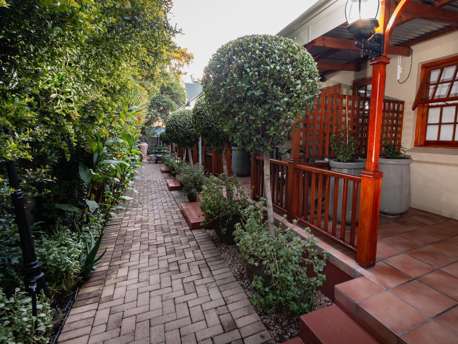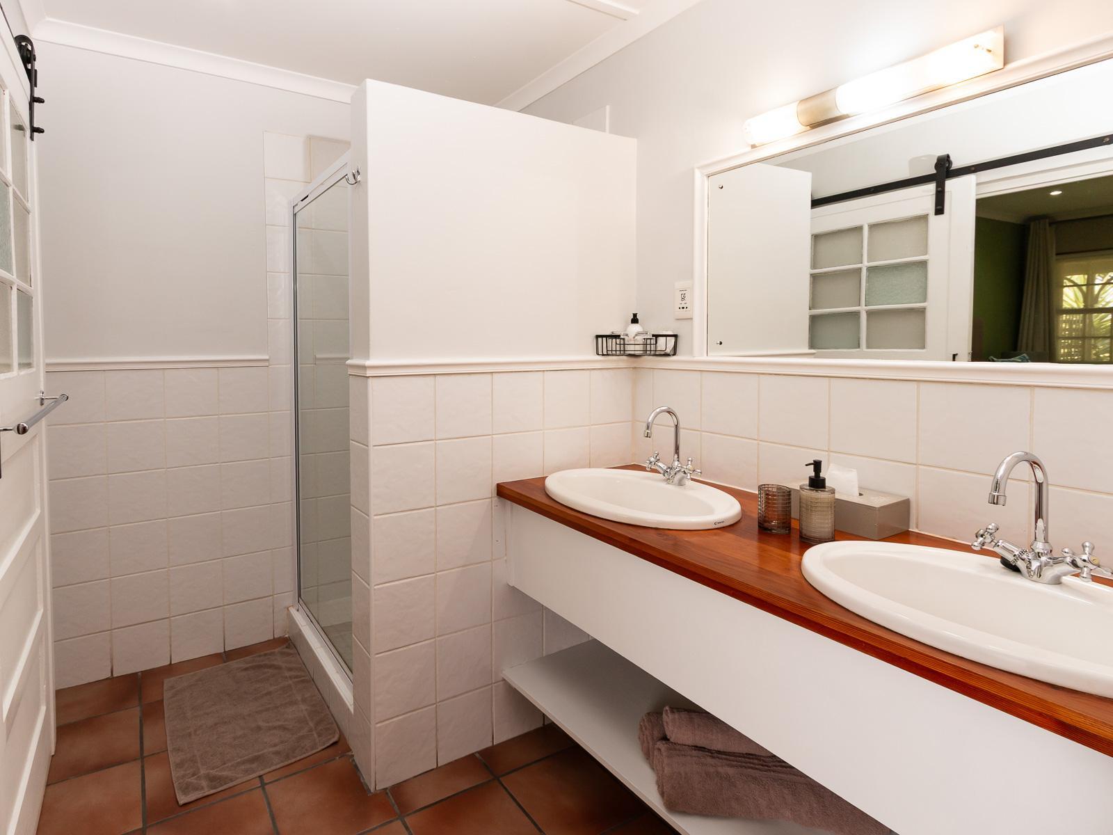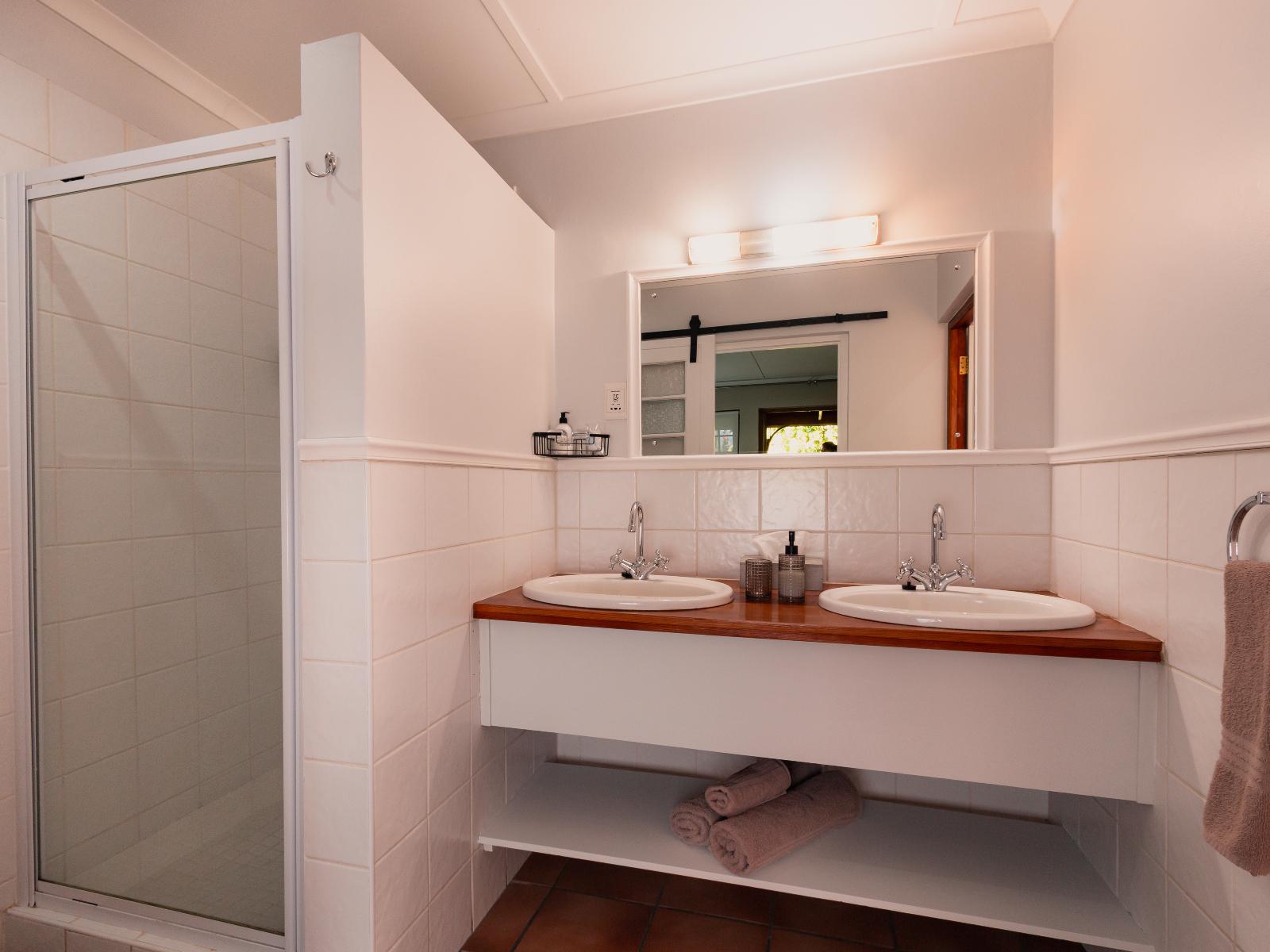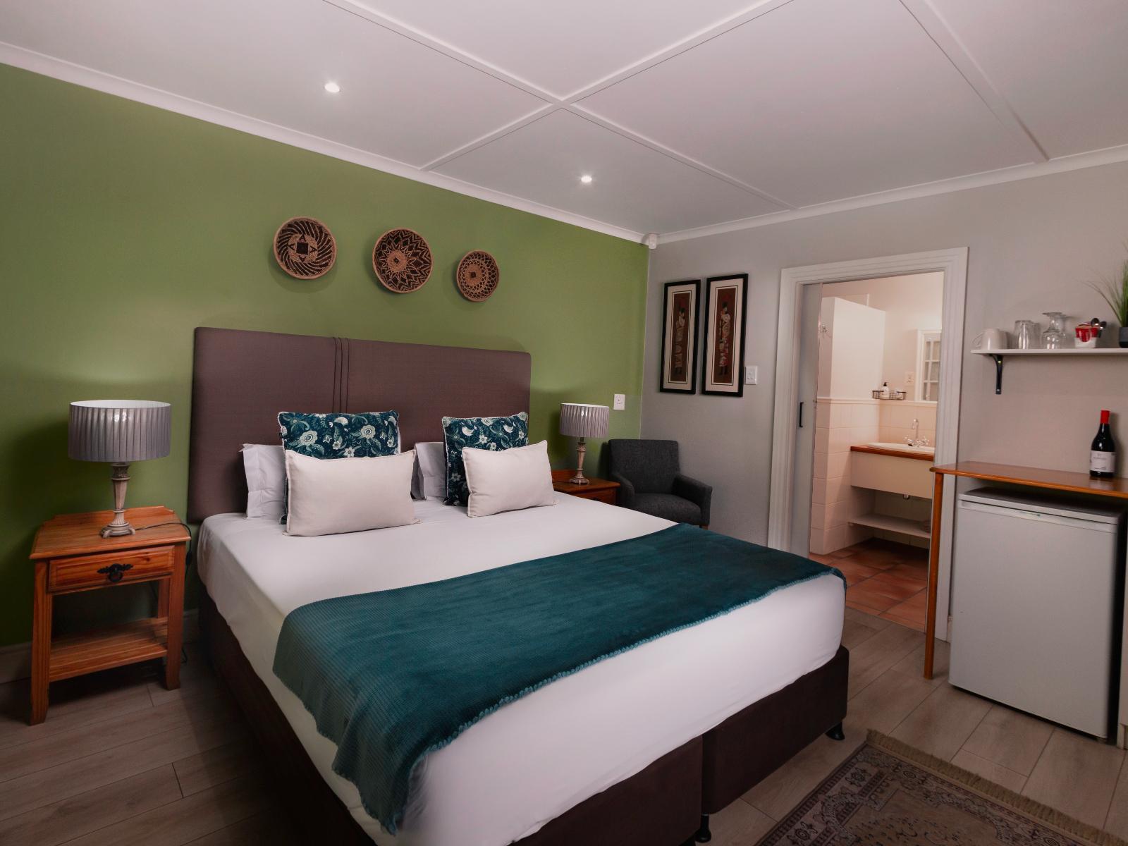 The Stoep/Veranda Room has Extra Length King bed with a shower en-suite, twin basins, hairdryer, mini fridge, TV and air-conditioning. French doors open out from the room onto a private veranda with seating, overlooking a small garden.