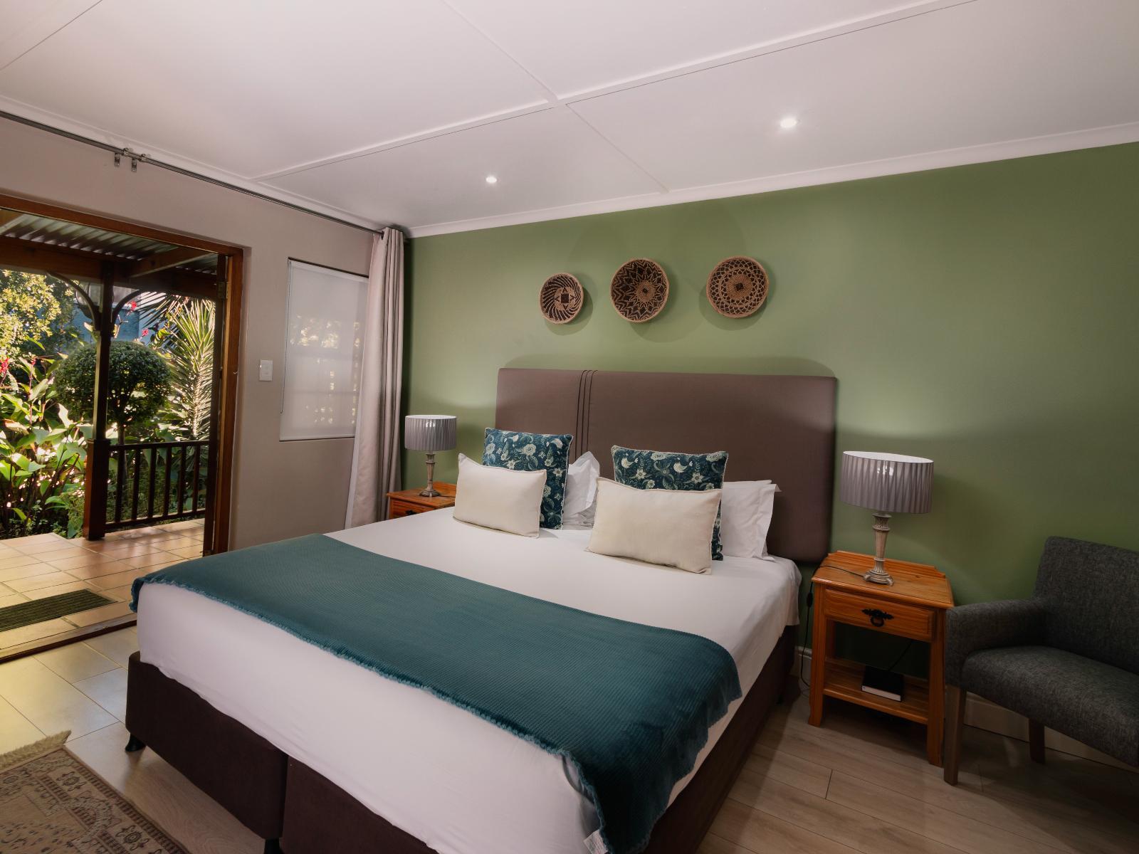 The Stoep/Veranda Room has Extra Length King bed with a shower en-suite, twin basins, hairdryer, mini fridge, TV and air-conditioning. French doors open out from the room onto a private veranda with seating, overlooking a sm. Specify King or 2 Singles.