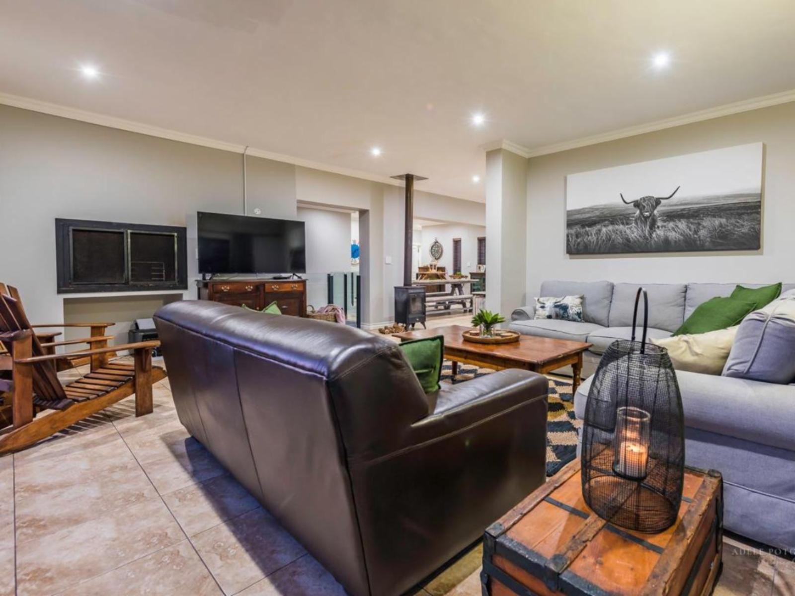 This double-storey holiday home features three bedrooms and two-and-a-half bathrooms, including a king en-suite, a queen room, and a twin room. Enjoy a full kitchen, TV lounge with fireplace, dining area, sun/braai room, and double garage.