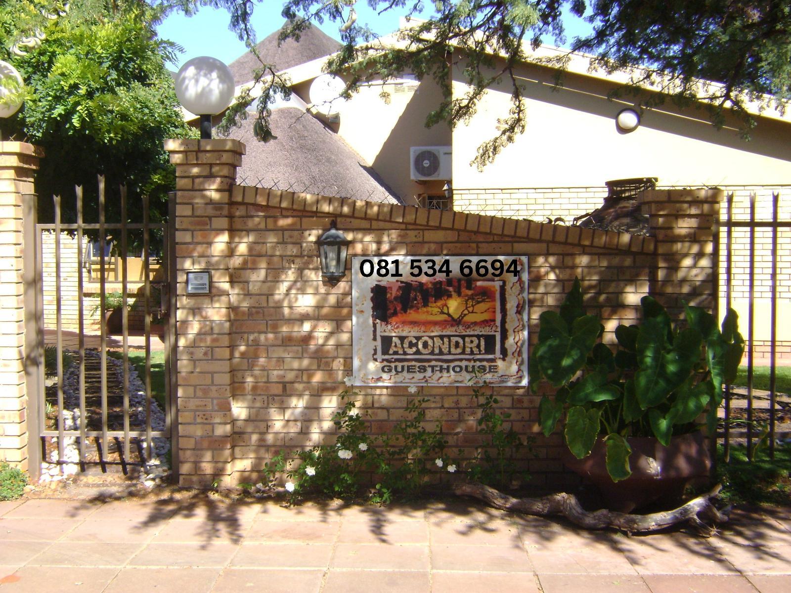 Nestled in the charming town of Kathu, Northern Cape, Acondri Guesthouse offers a peaceful stay in South Africa’s renowned iron ore capital. True to its name, which means "town under the trees," Kathu is surrounded by the unique beauty of one of only two Camel Thorn tree forests in the world. Our guesthouse features a selection of comfortable, air-conditioned en-suite rooms. Choose from single, double, twin, or family rooms, each equipped with a TV (with selected DStv channels), a bar fridge, microwave, and tea-and-coffee-making facilities. Guests can enjoy breakfast and dinner on request, and unwind in our leisure areas that include a refreshing splash pool, snooker table, and a cosy lapa with a TV – perfect for watching rugby or your favourite sports while enjoying a traditional South African braai. Ideally located for travellers exploring Kathu, Acondri Guesthouse is just a short drive from top local attractions such as the Kathu Golf Club, an 18-hole course known for its natural beauty, and the Kathu Village Mall, offering shopping and dining options. Nature lovers will enjoy a visit to the Kalahari Meerkat Project and the nearby Witsand Nature Reserve, known for its white dunes and "roaring sands" phenomenon. Whether you're here for business or to explore the unique Kalahari landscape, Acondri Guesthouse is your home away from home in the Northern Cape. Sishen Iron Ore Mine, Kumba and various other mines are within less than 10 km of the guesthouse, and the Sishen Airport FASS can be reached within 10 km. The property is off-the-grid, having access to borehole water and backup power during load shedding/power outages.