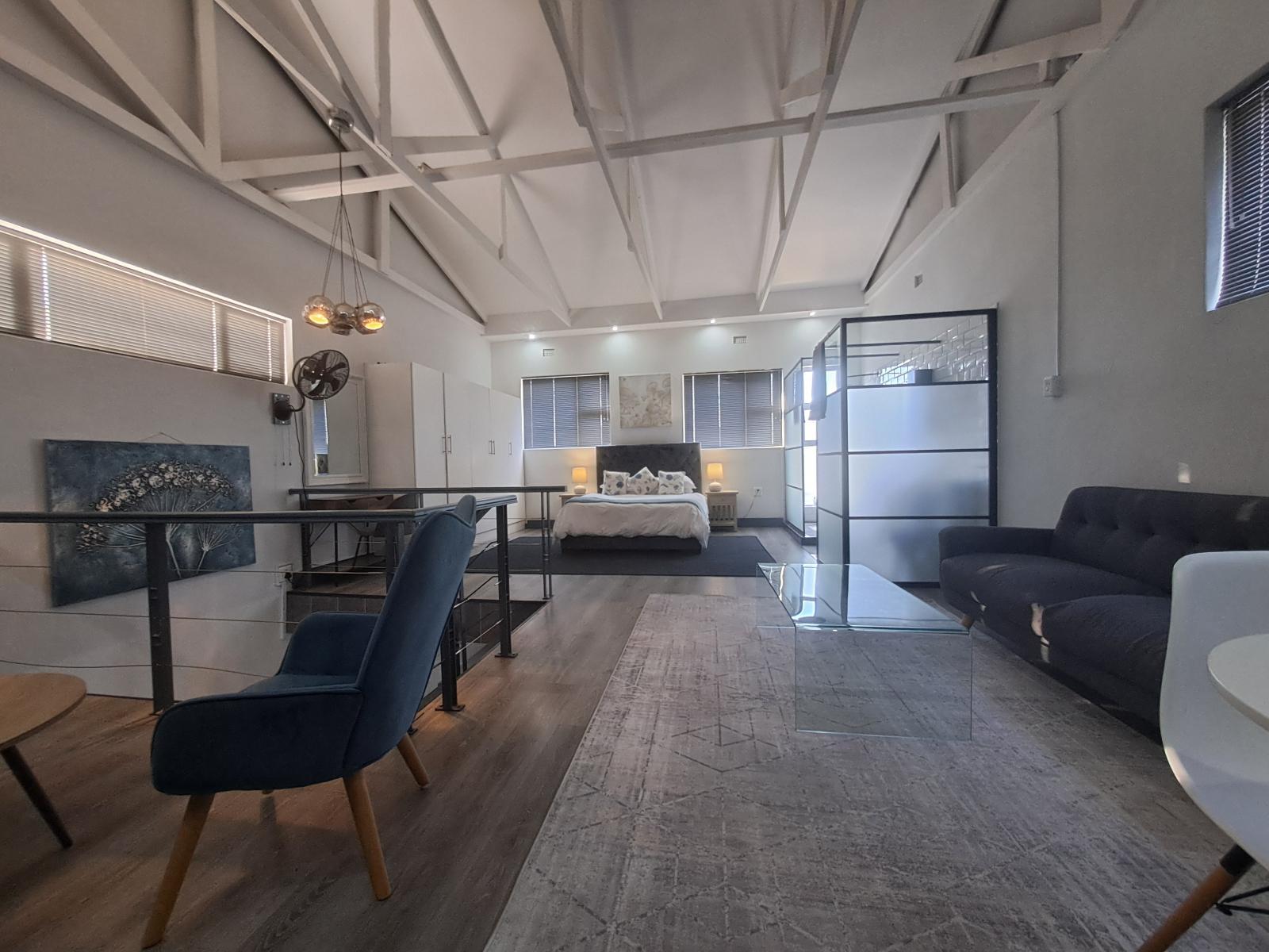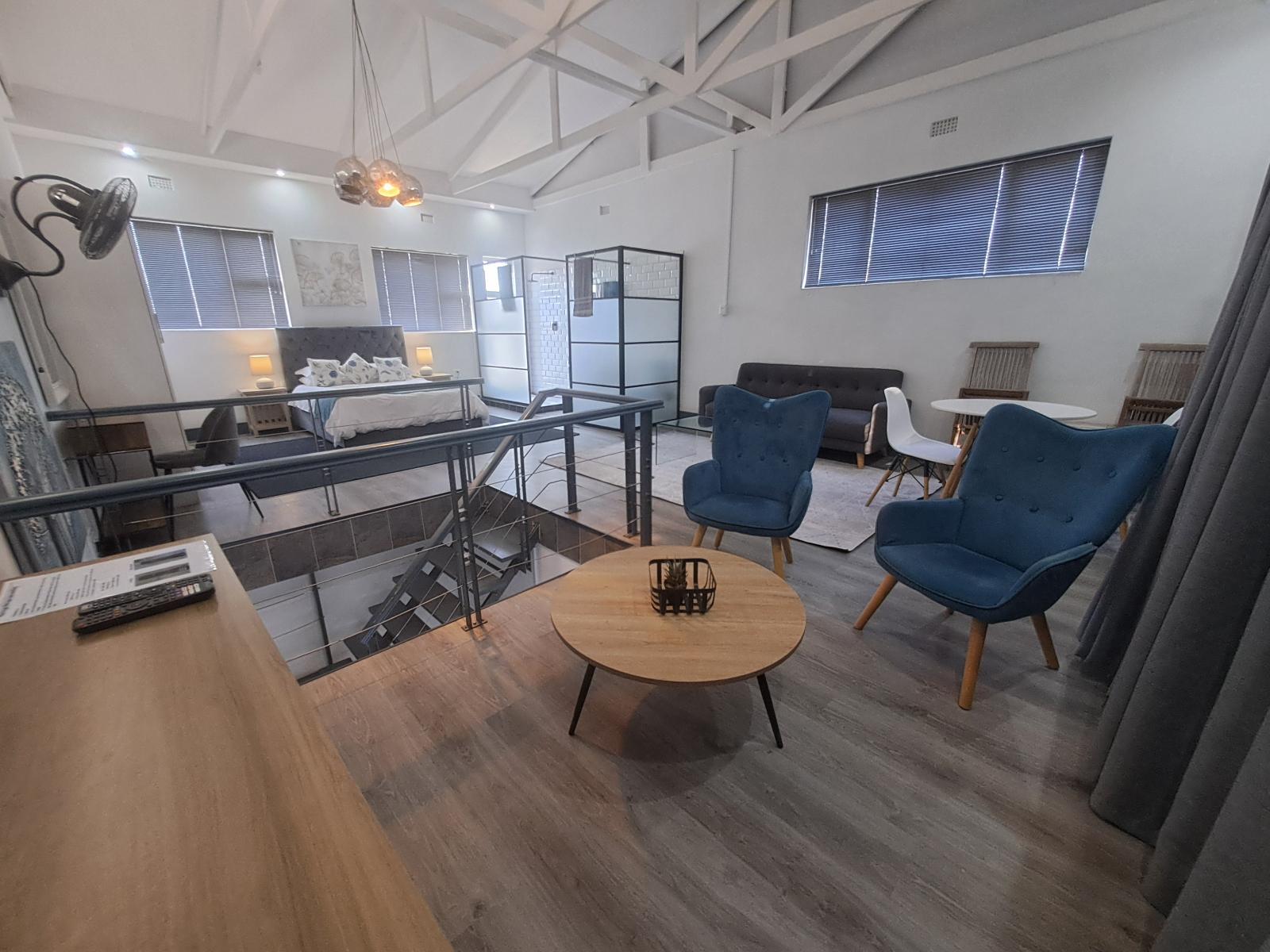The open-plan room has a double bed with linen, an en-suite shower and a loft area. The room has a kitchenette with a 2-plate stove and oven and tea and coffee-making facilities. Comfortable seating, TV, and Wi-Fi access are available.