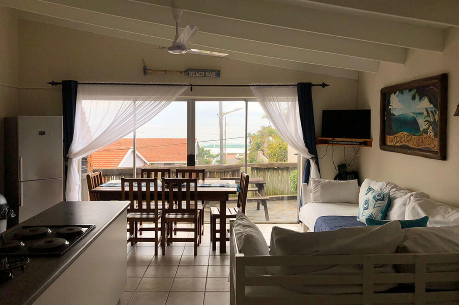 Lovely large 4-6 sleeper apt with sea views.1x double bed, en-suite bathroom in main bedroom. 1x bunk bed & 2 single couch beds in open lounge/kitchen area with bathroom. Equipped kitchen. Upstairs unit, closest to beach. Pvt bbq area. DSTV Hotel Package