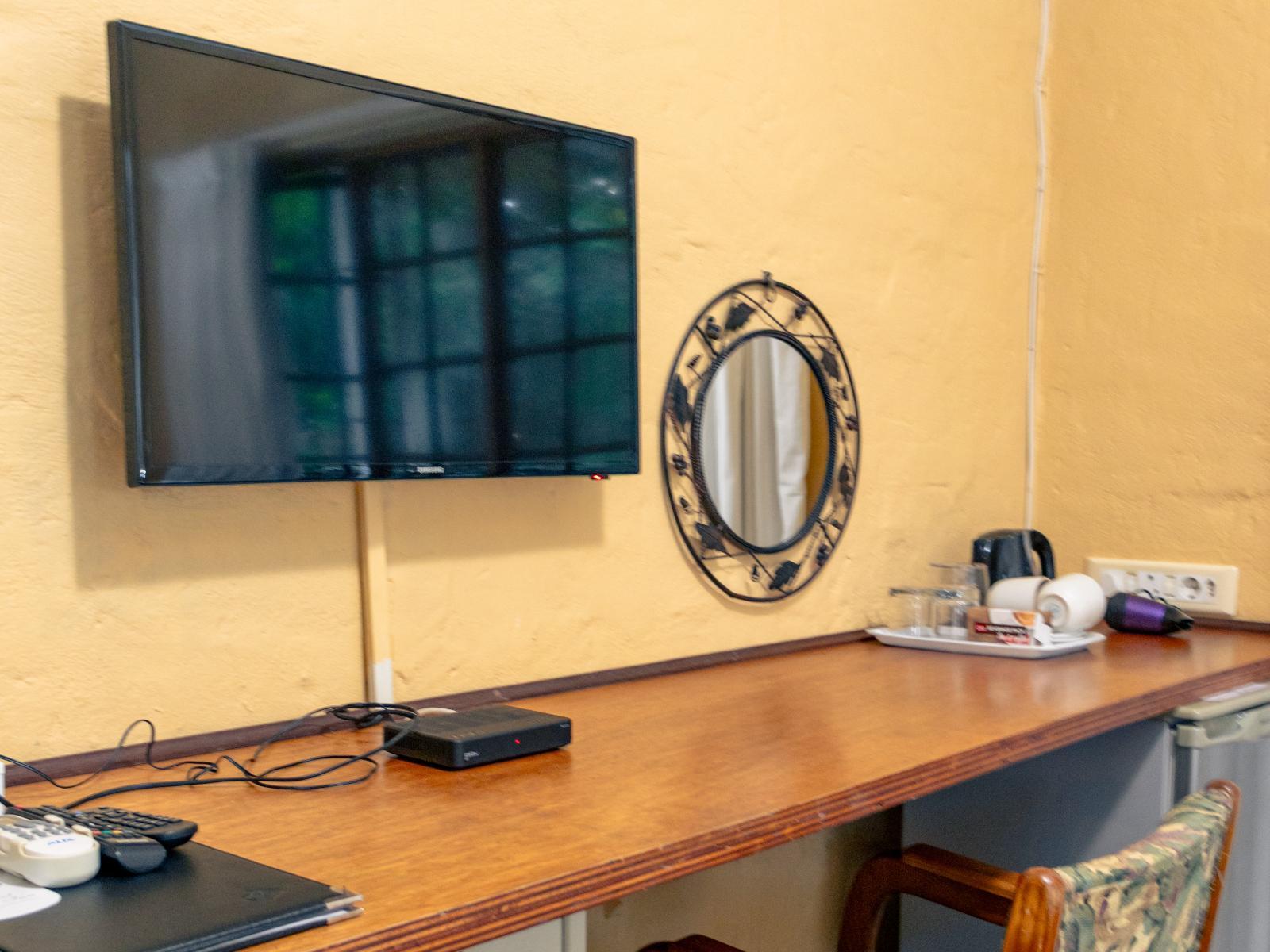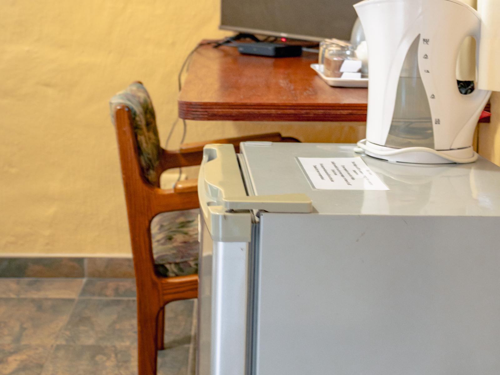 Each room has a double bed, and an en-suite bathroom. Each room contains hot/cold Air-conditioning, a kettle, a beverage pack, a TV with 63 DStv channels, a lounge area, and a bar fridge.