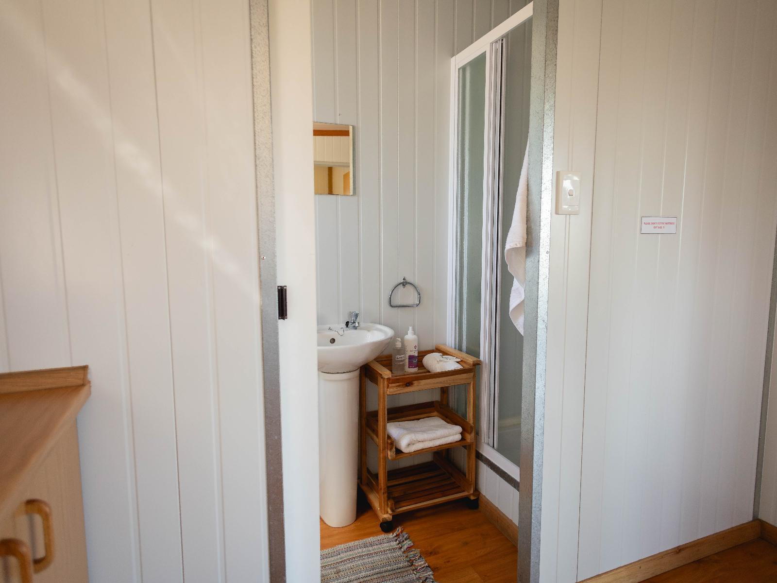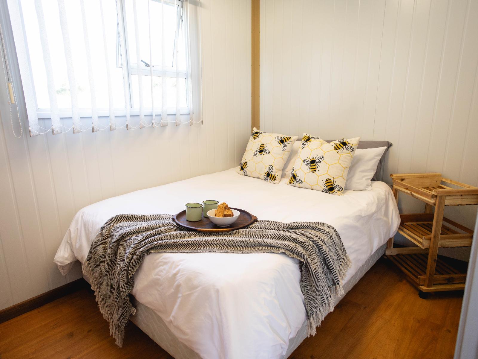 One bedroom chalet with a double bed, en-suite bathroom with a shower, and a sleeper couch for one child in the living area. Equipped kitchen and dining area with an inside braai area.