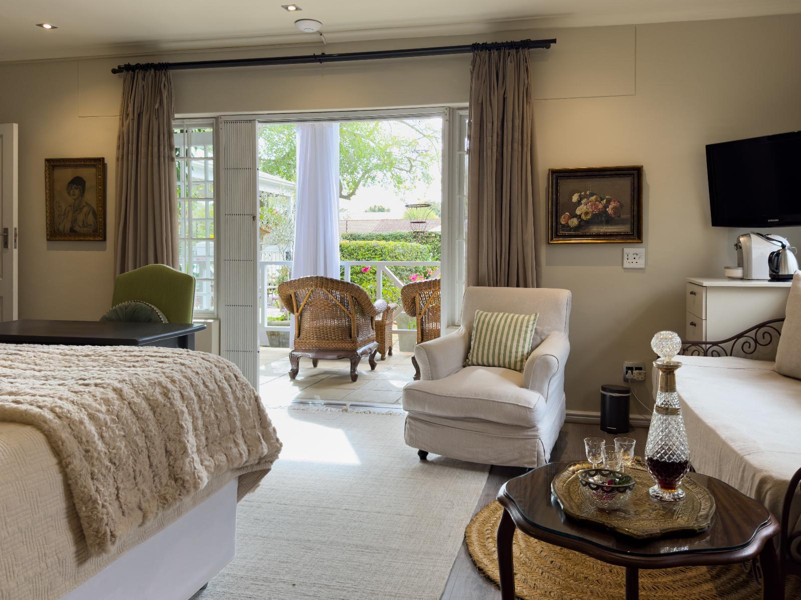 This room offers a super king-size bed that is easily separated to comfortably accommodate singles. The vintage decor makes for a soft, romantic stay. The private veranda opens up to the colourfully kept gardens that wrap around the guest house.