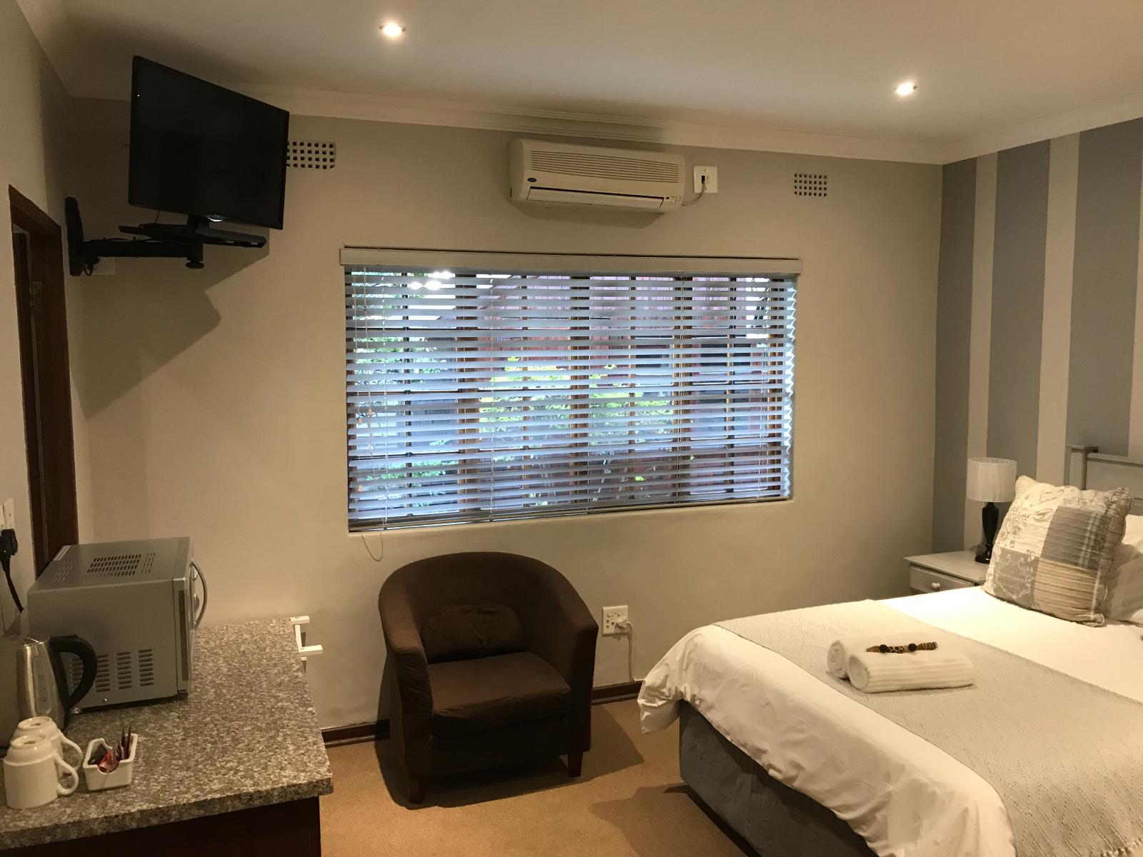 Double bed with 100% percale linen Air conditioning En suite bathroom. Workstation & free Wi Fi Leisure chairs Kitchenette with Microwave and kettle. Coffee, tea. Flat screen Tv commercial DSTV Towels & amenities Bar Fridge