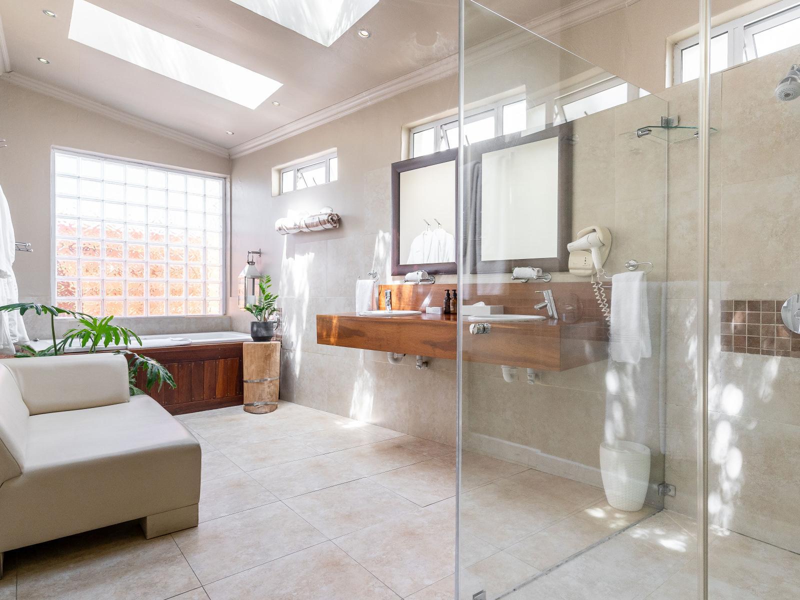 The room has fresh and contemporary interiors, a modern bathroom and sitting area. This first-floor room is accented by a leather couch, white linen, wood finishes and reed walls, giving it the chic ‘out of Africa’ appeal that blends perfectly.