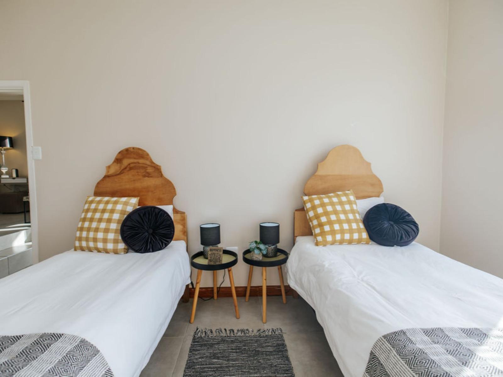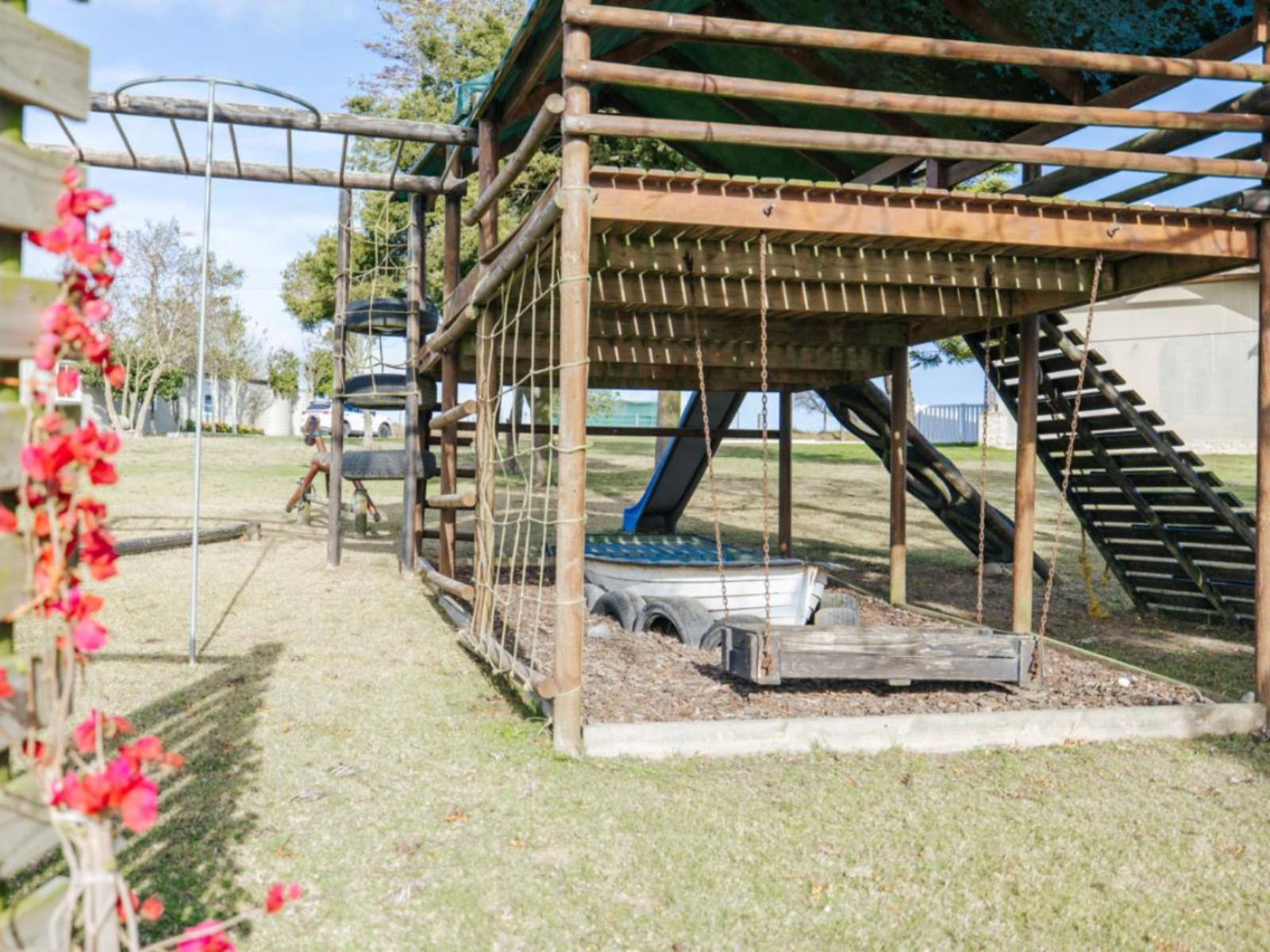 This spacious farm unit sleeps 7 guests across four bedrooms and two bathrooms. It features 2 queen beds, 2 singles, a three-quarter bed, a toddler bed and a baby cot, an outdoor braai space, and a play area for kids.