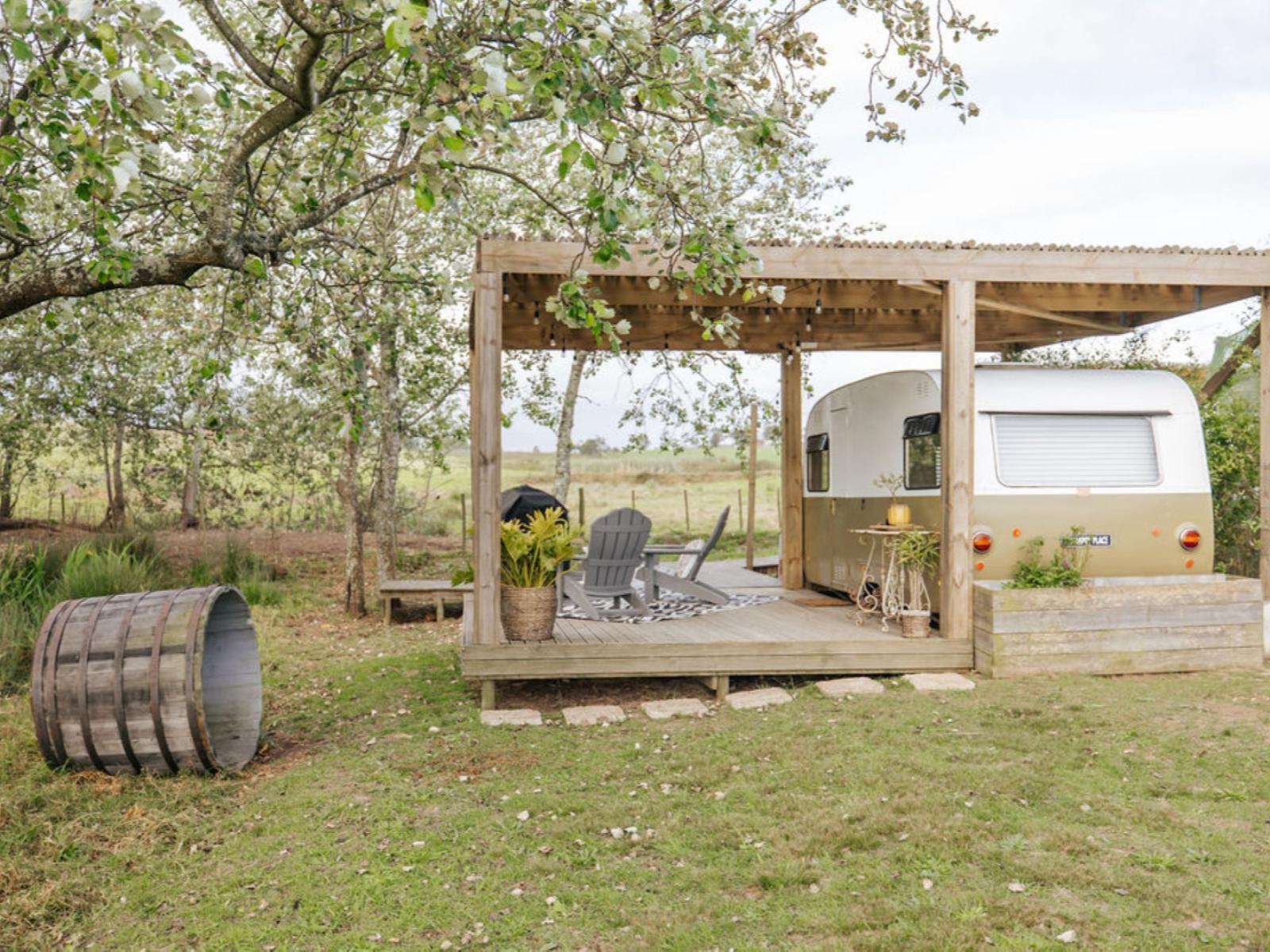 This cosy, rustic glamping caravan is a private, romantic retreat for couples. It features a comfy double bed, a neat rustic bathroom with a view, an outdoor kitchenette, and is nestled on a peaceful farm for simple country living.