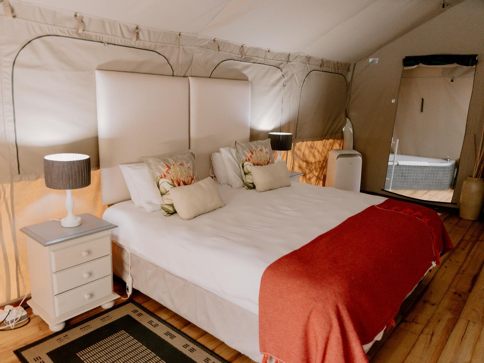 The luxurious en-suite tented chalets is situated on wooden decks, but is private under a canopy of trees. The showers, with a roof of stars - something to experience. 2 stretchers can be provided for kids under 13. "Highly Recommended" by Drive Out.