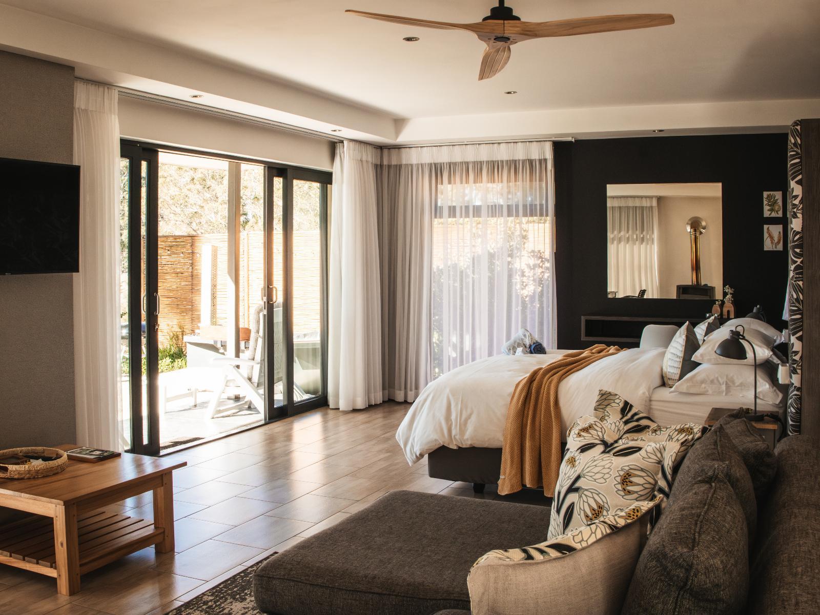 Welcome to denBosch, a hidden gem where the harmonious blend of birdsong, the majestic Outeniqua mountains, and the unique beauty of the Cape Fynbos create an idyllic retreat. This piece of heaven is conveniently situated between Knysna and Buffels Bay, 5 km from the N2 and only 65 km from George Airport. Escape the tumultuous pace of modern living to take a breather in this enchanting piece of blissful countryside, nestled in the secluded district of Rheenendal. Wake up to the gentle melodies of birdsong, enjoy the outdoors, and absorb the fresh mountain air, or enjoy a quiet afternoon on your private patio to witness the kaleidoscope of sights and sounds that fill the air. Our 4 stylish and thoughtfully designed cottages complement the surrounding landscape and seamlessly integrate luxury and natural beauty. Each room offers panoramic views of the mist-kissed Outeniqua mountains and dense Knysna forest, creating a sense of connection with the environment. Your comfort is our priority, and that is why we include the best of both worlds with modern amenities that complement the surrounding natural beauty. Our spacious one-bedroom layout is decorated to exude warmth and tranquillity and includes: * A cozy living area with both comfortable indoor and outdoor seating. * Ceiling fan to keep cool during the summer months. * A well-equipped kitchenette with a gas stove top (no oven), coffee machine, fridge, and an array of utensils. * A luxurious king-size bed dressed in 100% cotton sheets. * A modern bathroom with a large walk in shower & cotton towels (there is no bath). * A cozy fireplace to keep you warm in the infamous cold and wet weather of the region during winter months. * Relax in the wood-fuel hot tub under the stars. * Every unit has a Weber for a tranquil braai on the stoep. * Smart TV (access to your favourite online Apps) * Free Wi-Fi * Off-grid ready - you will not feel the effect of unpredictable loadshedding / electricity blackouts. Book your stay today and get ready to relax, recharge, and connect with nature.
