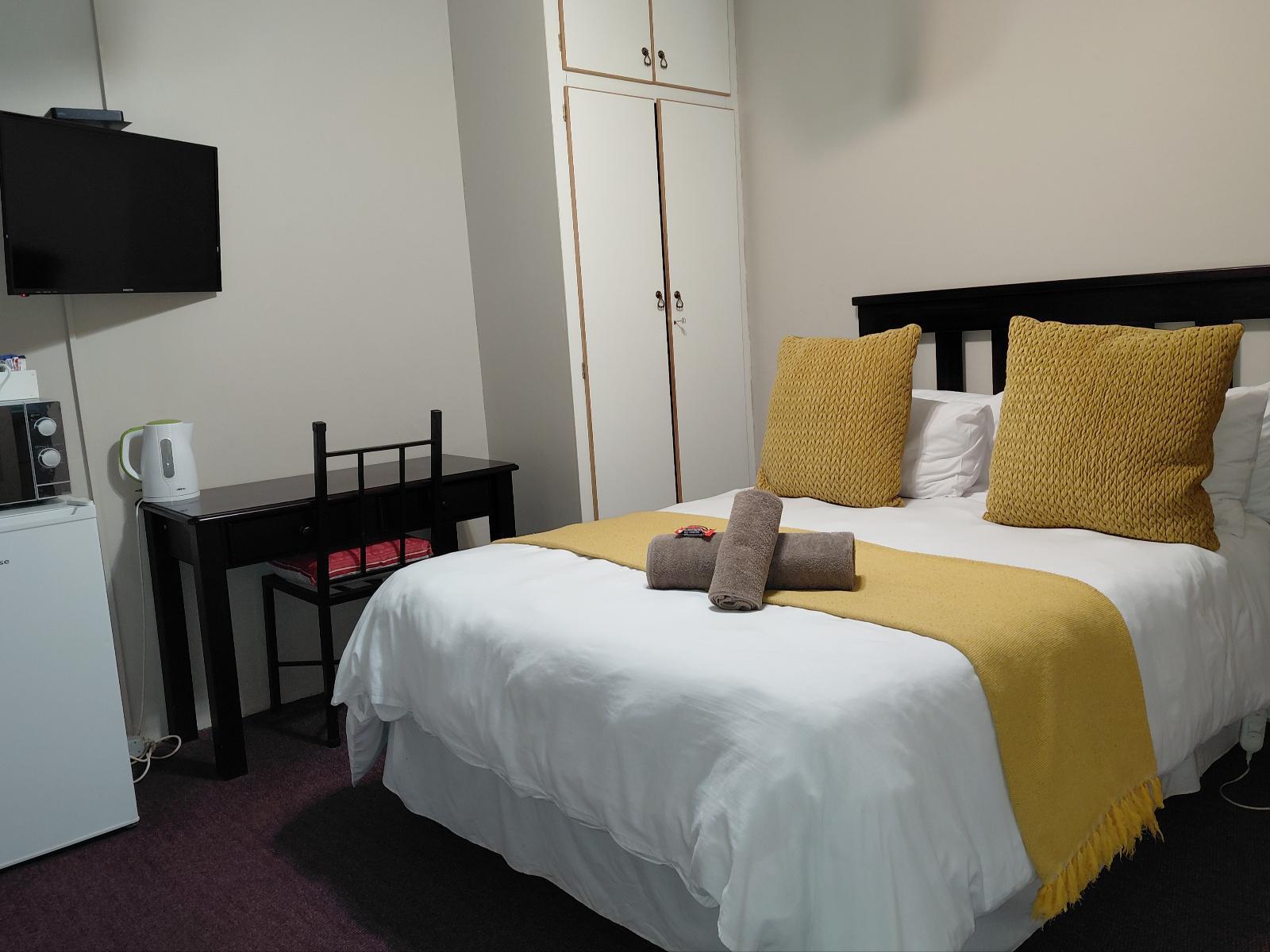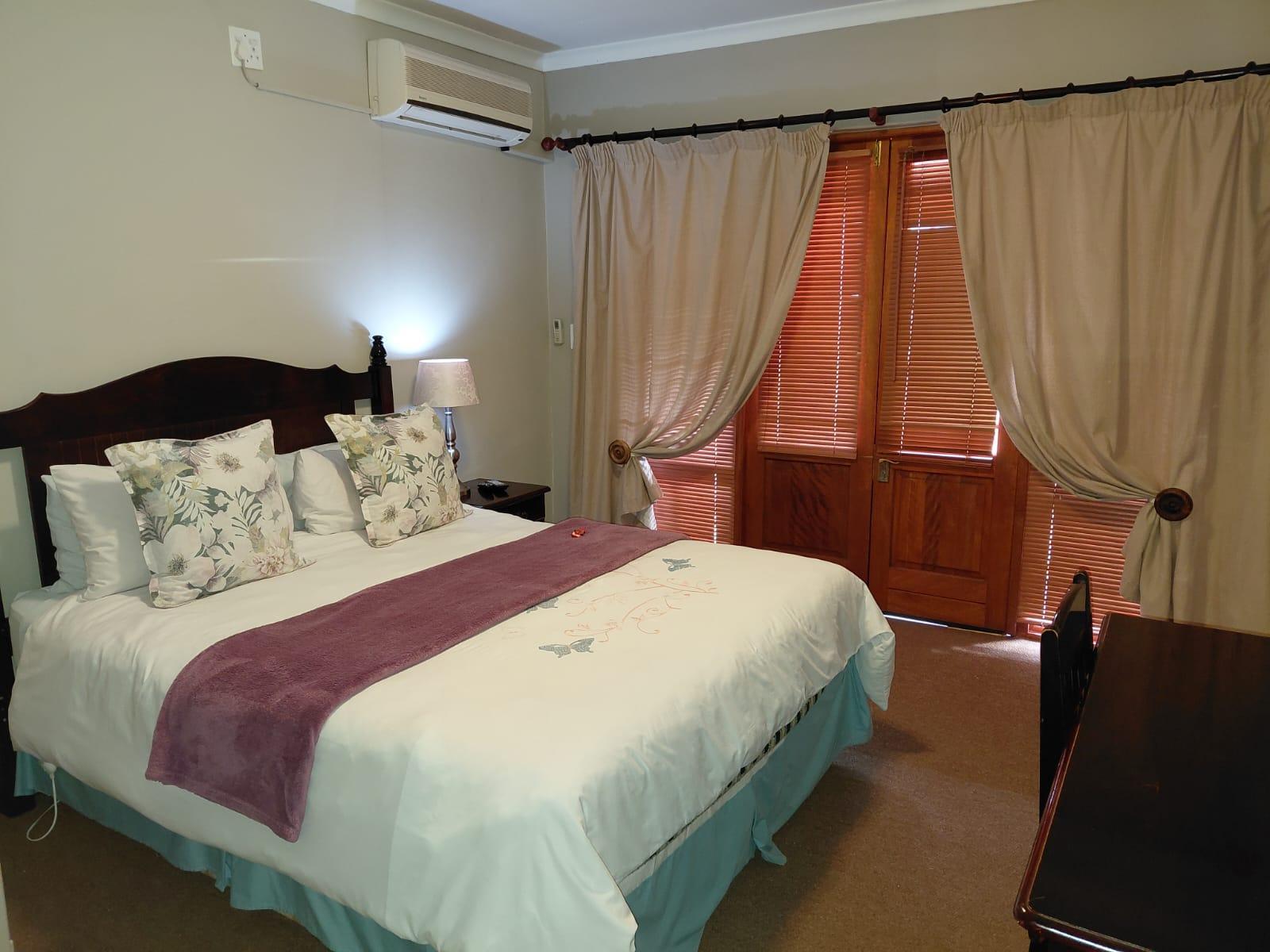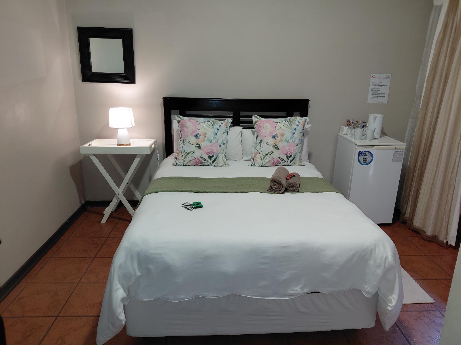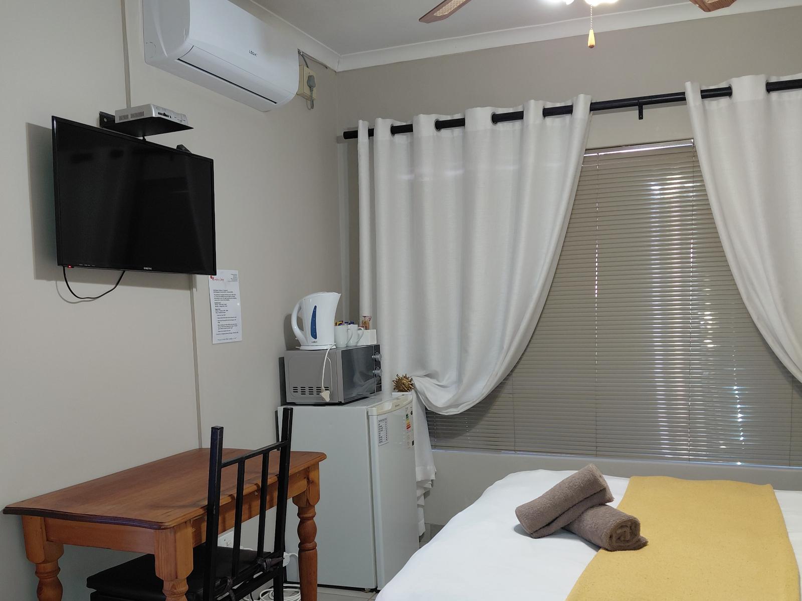This room has a queen bed and a bathroom with a shower. It includes air-conditioning, a TV with DStv, a working desk, a bar fridge, and coffee-and tea-making facilities.