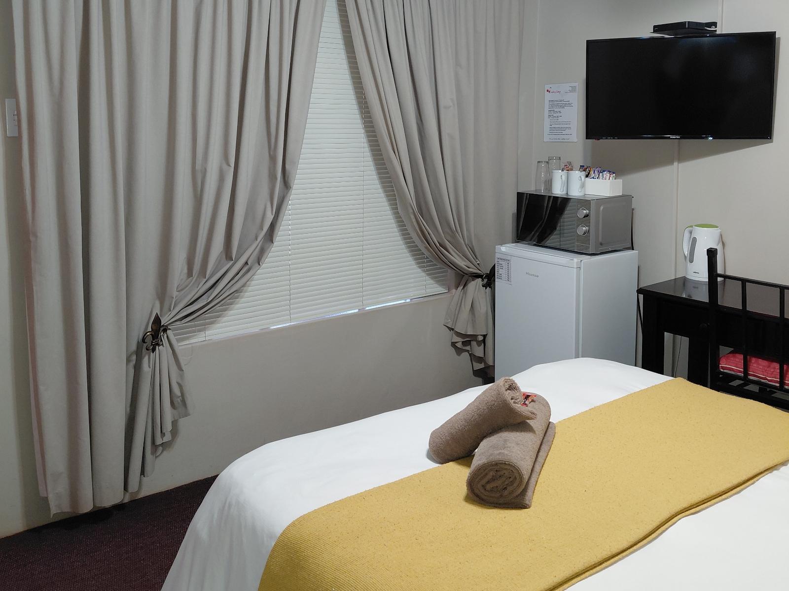 This twin room has 2 three-quarter beds and a bathroom with a shower. It includes air-conditioning, a TV with DStv, a working desk, a bar fridge, and coffee-and tea-making facilities.