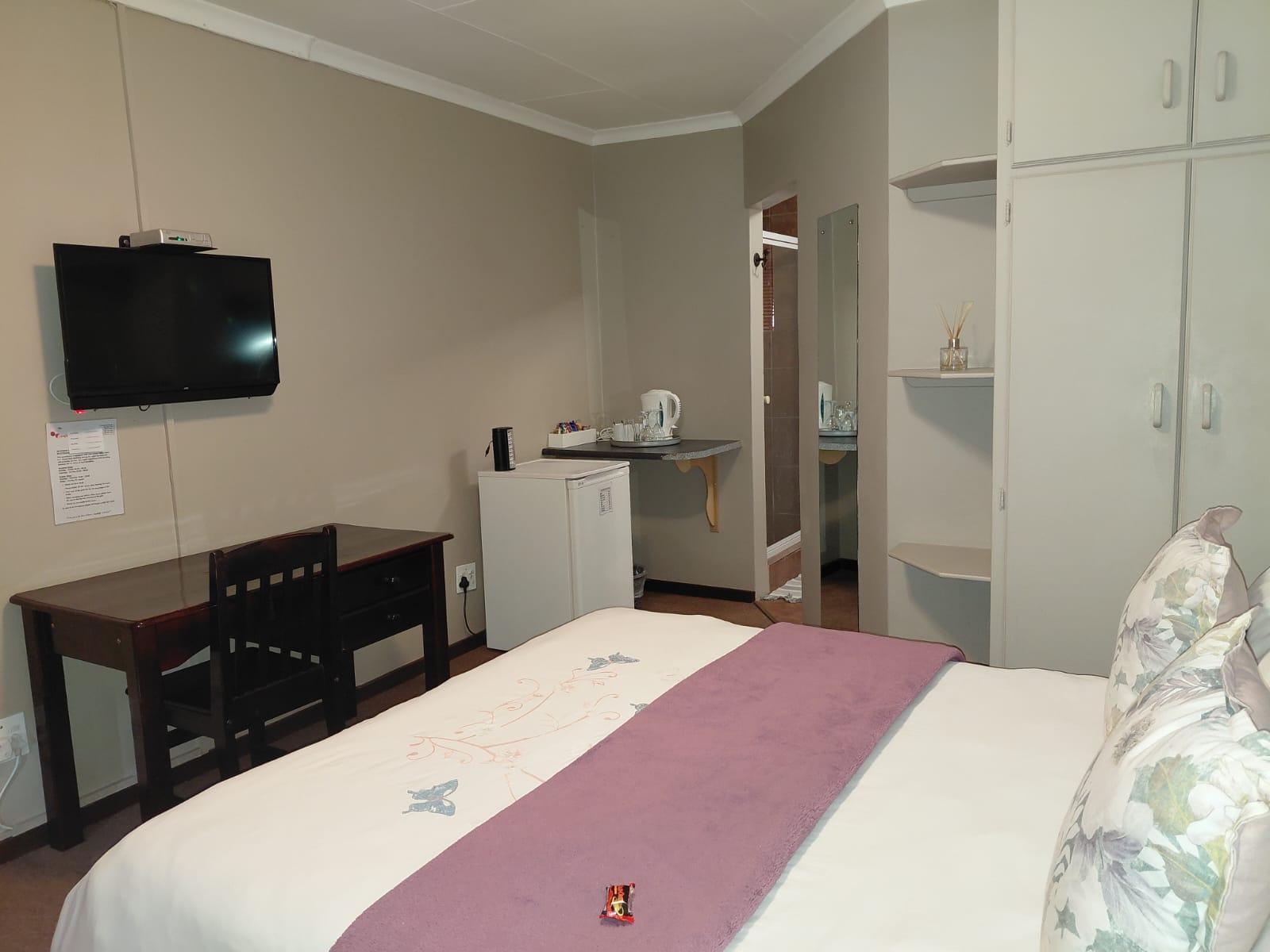 The room has a double bed and a bathroom with a shower. It includes air-conditioning, a TV with DStv, a working desk, a bar fridge, and coffee-and tea-making facilities.
