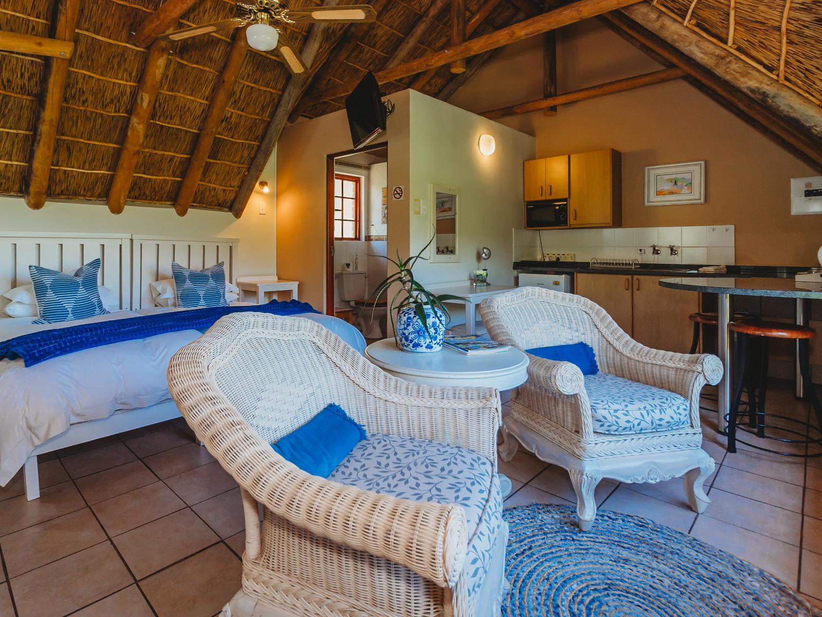 This room offers a queen size bed, en-suite bathroom (shower only), dining area & kitchenette. This spacious room is situated almost in the middle of the property, has a cosy balcony, is on the first floor with high thatched ceiling to add to its charm.