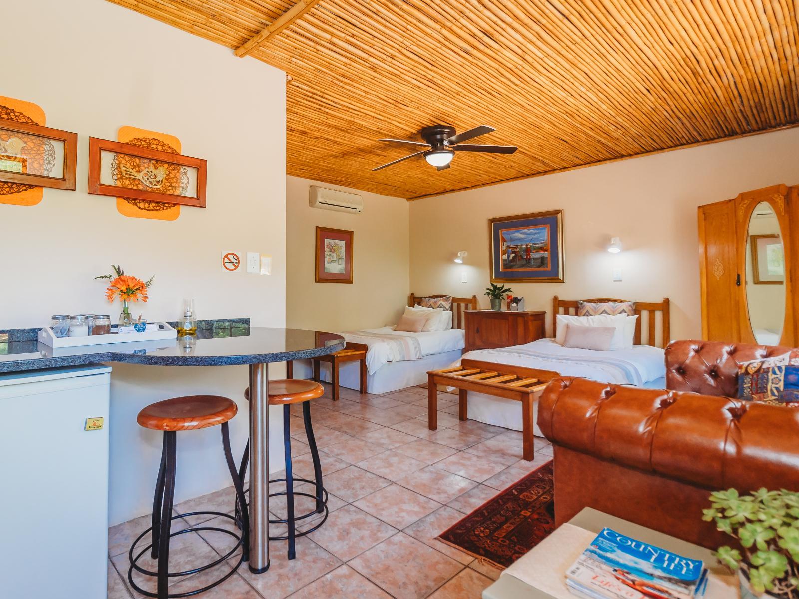 This spacious room offers two 3/4 beds, en-suite bathroom (shower only), dining area and kitchenette. Room 3 is on the ground floor with easy access from the parking area. Outside furniture under a thorn tree with many birds to keep you company.
