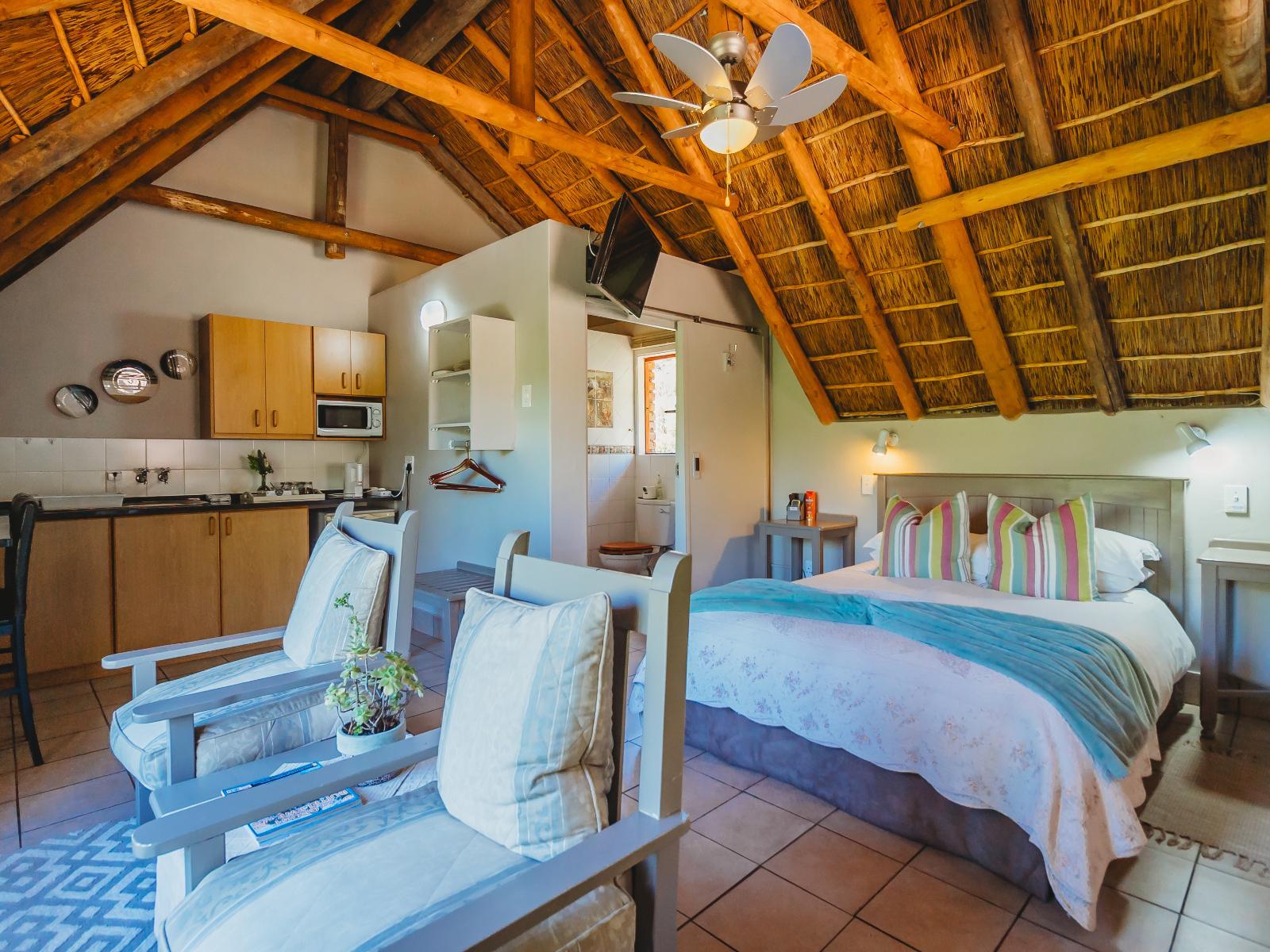 En-suite family units are spacious with high thatched ceilings & offer 2 single beds in an open loft room, ideal for children 5-12 yrs. As well as two single beds in main room with dining area, TV and kitchenette. Beds can be converted to King on request