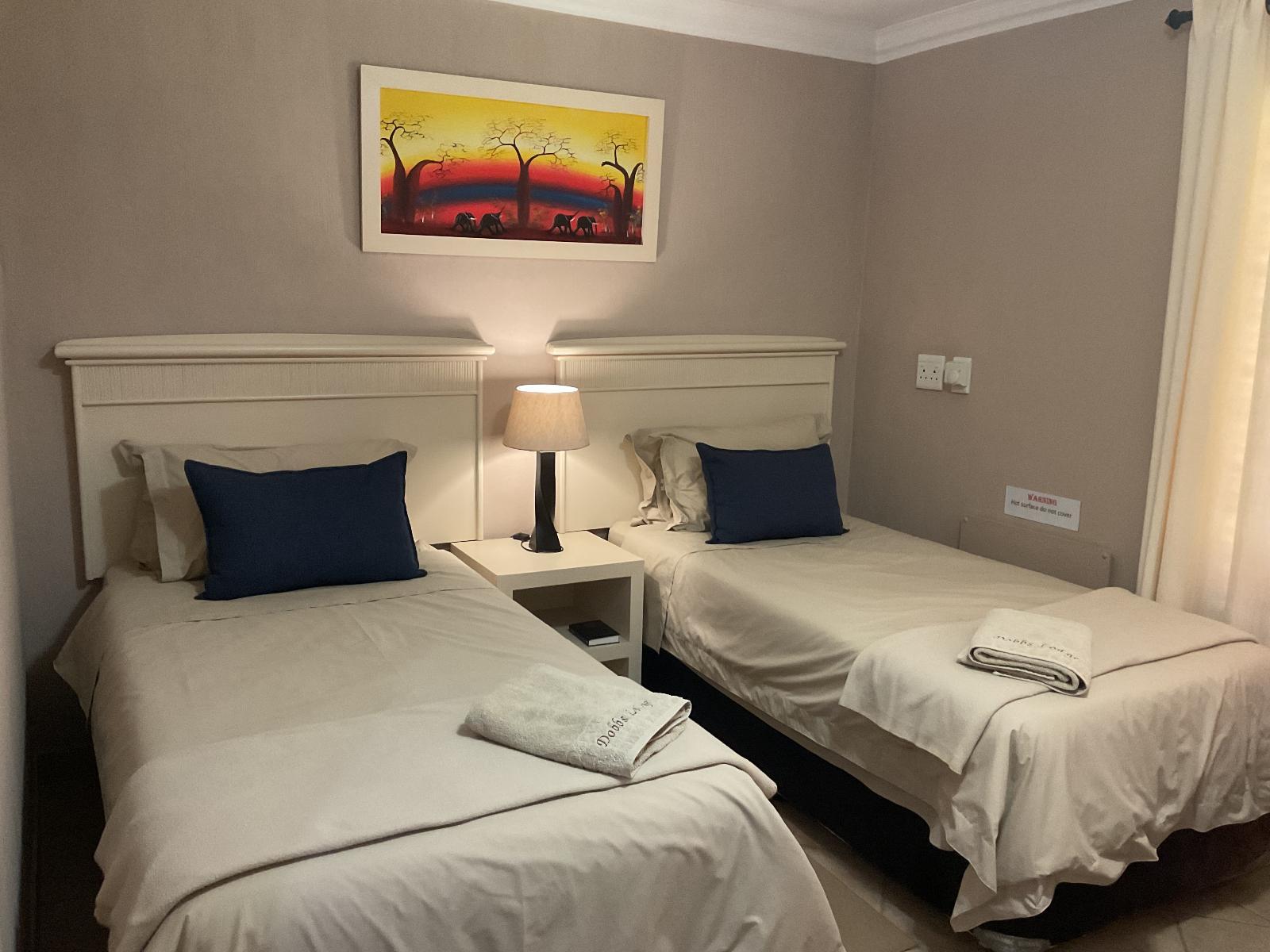 This room has 2 single beds. the room has 32Cm tv with 7 channels available including DSTV, Wi-Fi, Bar Fridge, Hair dryer, Air-con, Panel Heaters, Iron On request, Cutlery & crockery, Tea/Coffee.