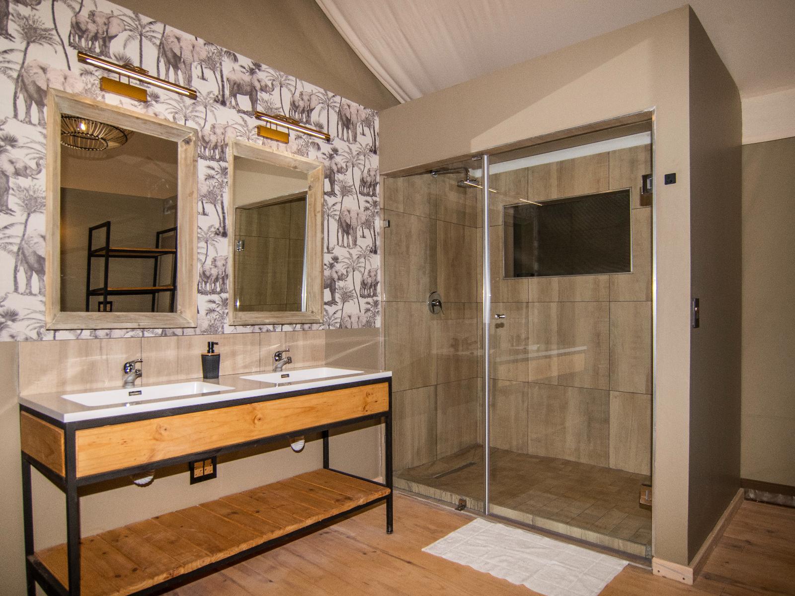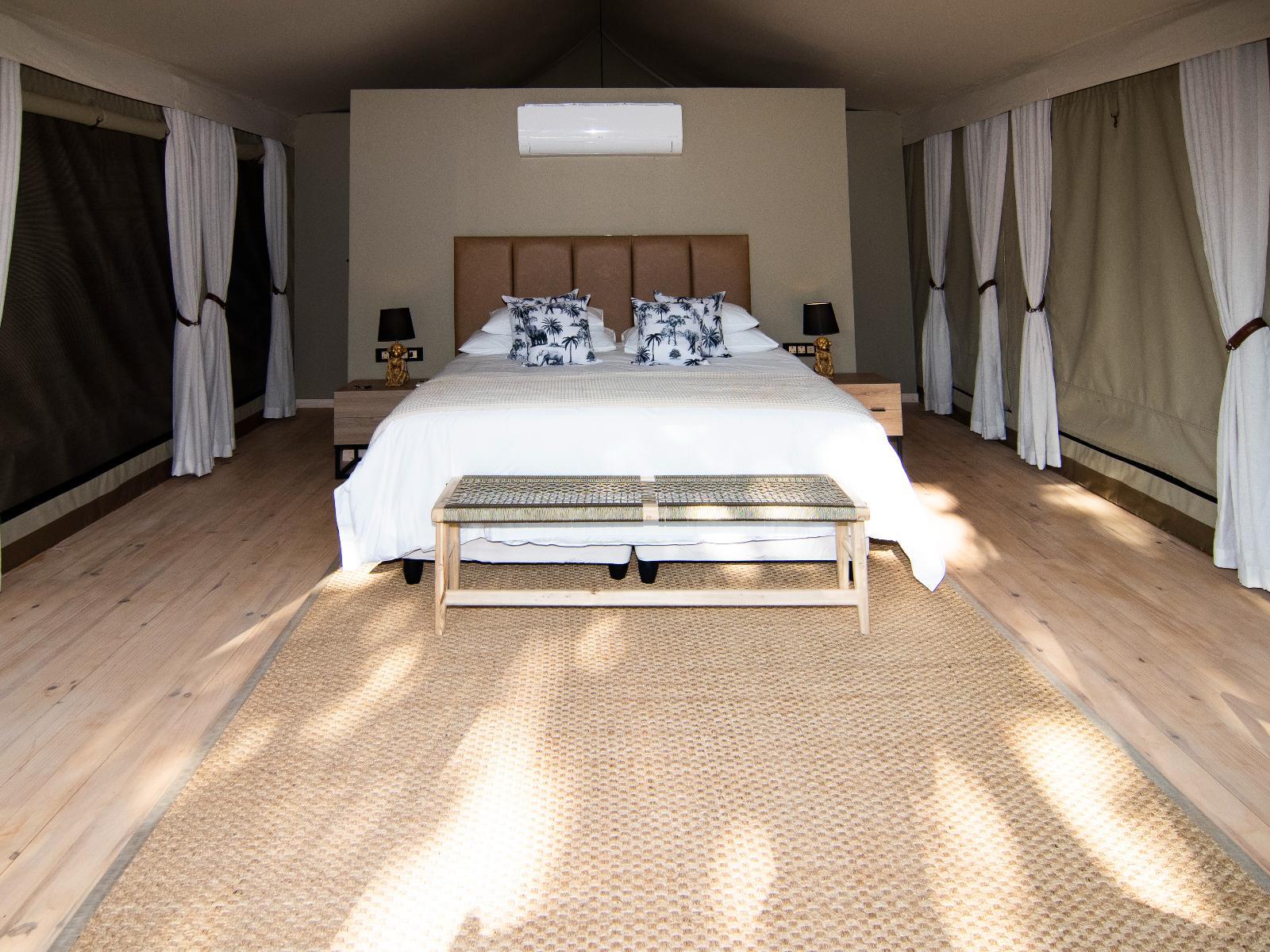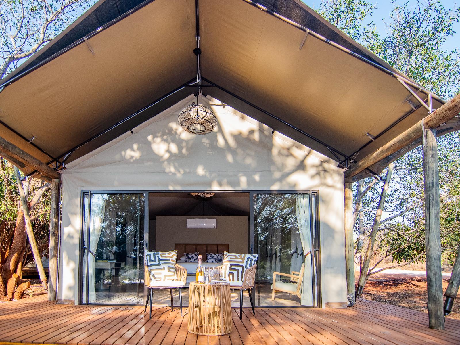 Each deluxe tented stand is furnished with a king-size bed, also possible to be set up as twins and an en-suite bathroom. Each tent boasts a sitting area, a desk, and a patio/terrace with bush views. One Game drive is included. SANPark fees excluded