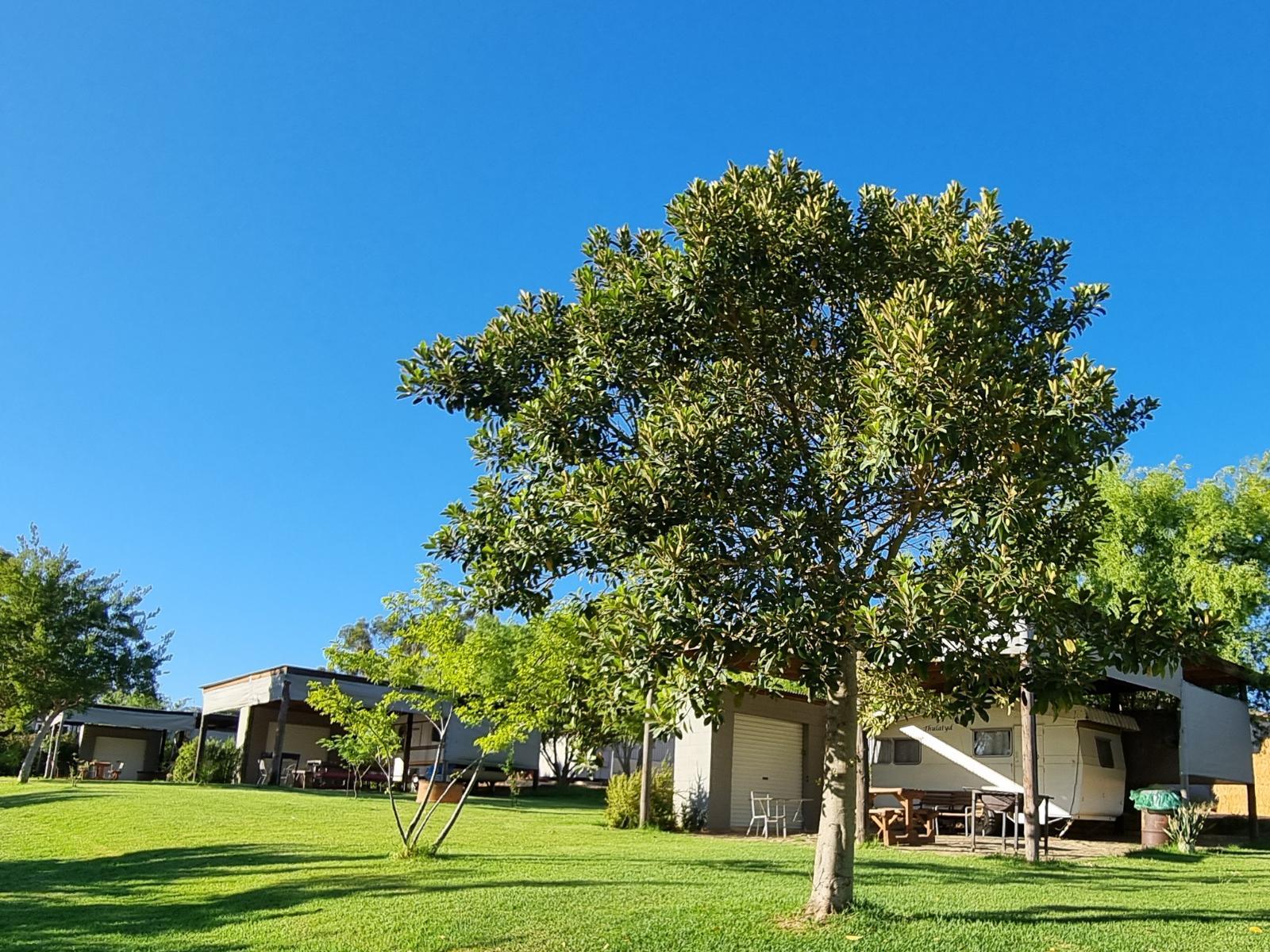 This comfy caravan has a queen bed, 2 single beds, and a covered patio with outdoor dining furniture, a braai and covered kitchenette fitted with a fridge-freezer and induction plate. The caravans have use of an ablution block with showers.