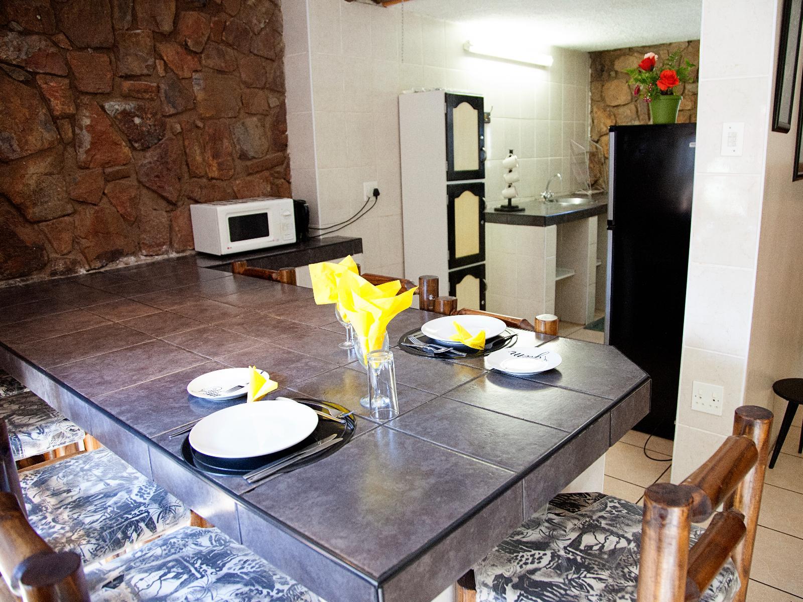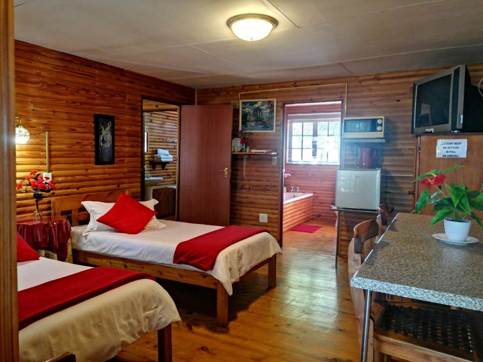 Self-catering log cabin sleeps 4 people. Two bedrooms with a double bed and 2 single beds. Kitchenette - small fridge, kettle, microwave and cutlery. 2 Bathroom with corner bath, basin, and toilet. 2 TV's - 5 channels incl 1 channel DStv. Air-conditioner.