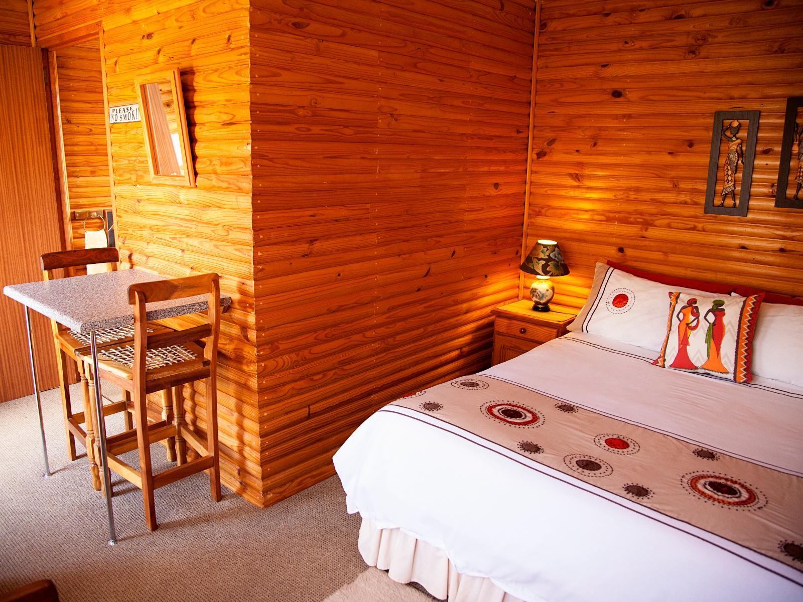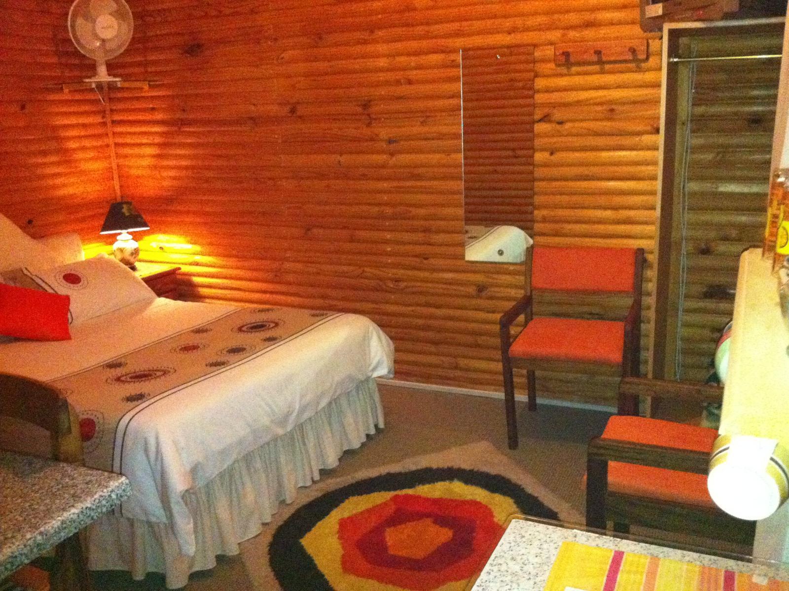 Self-catering log cabin sleeps 2 people. One bedroom with a double bed. Kitchenette - small fridge, kettle, microwave and cutlery. Bathroom with bath, basin, and toilet. TV - 7 channels included 1 channel DStv. Air-conditioner.