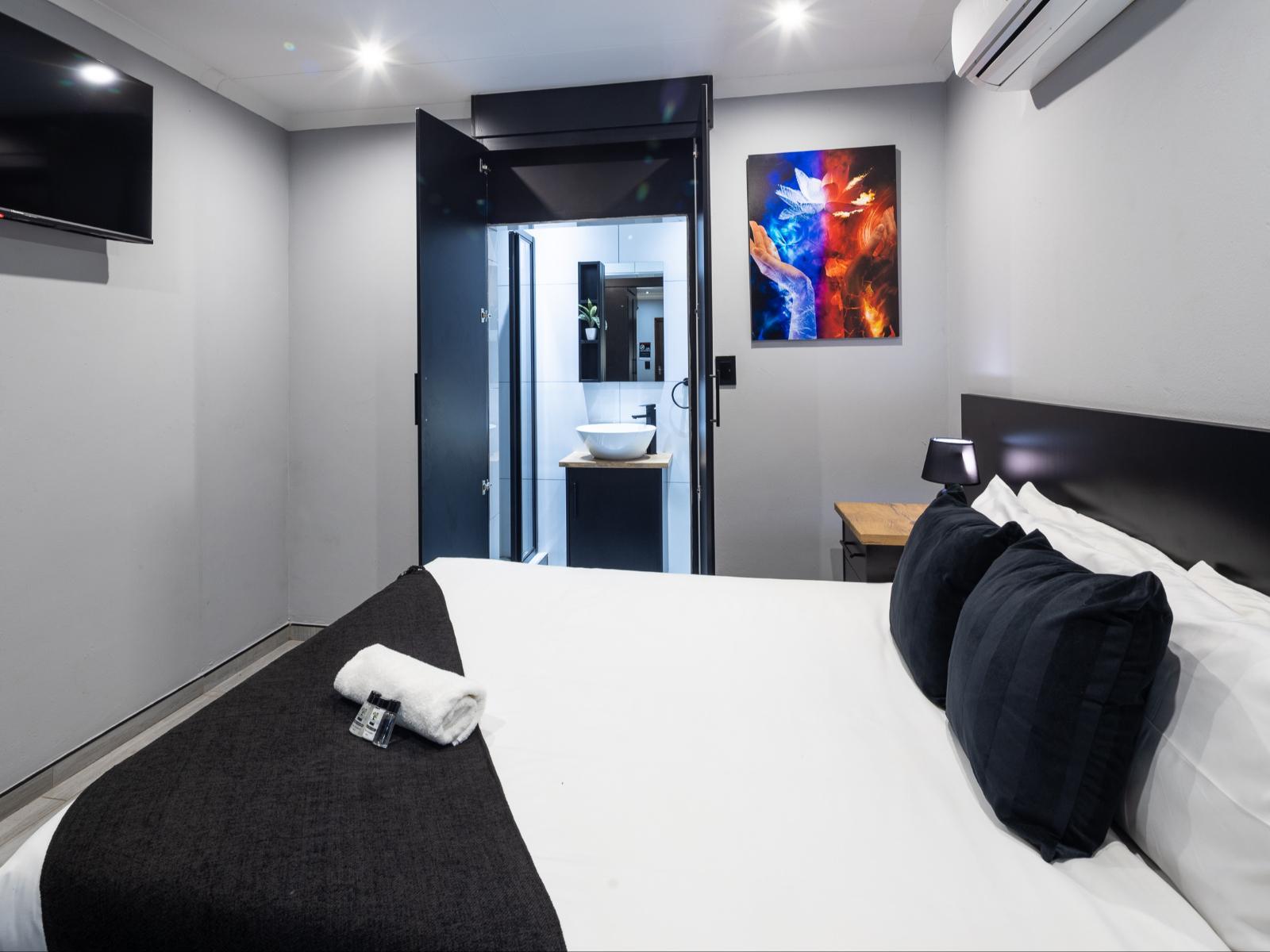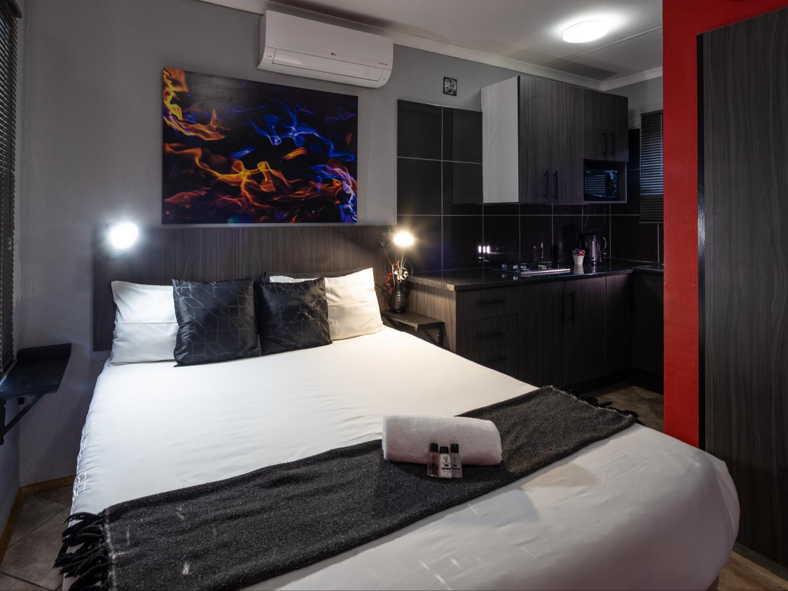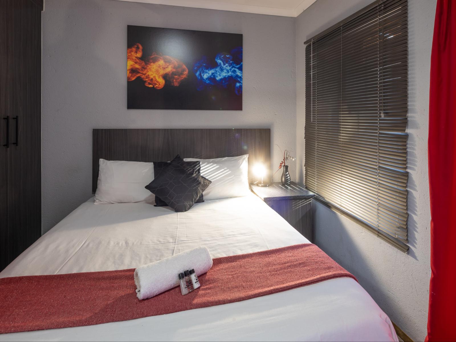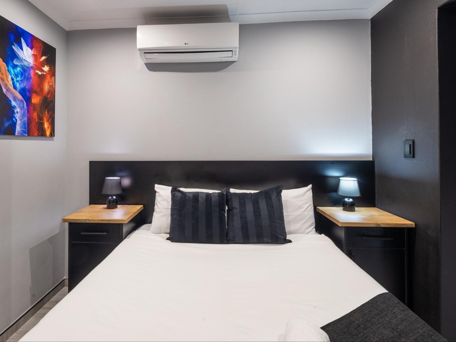 Our modern rooms which sleep 2, are fitted with double beds and an en-suite bathroom with showers. It boasts air conditioning, TV, DStv, WiFi, and a fridge/bar fridge. There is a fully equipped kitchen, braai facilities, and a pool in the common area.