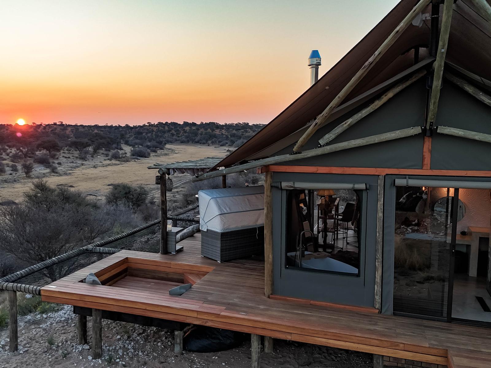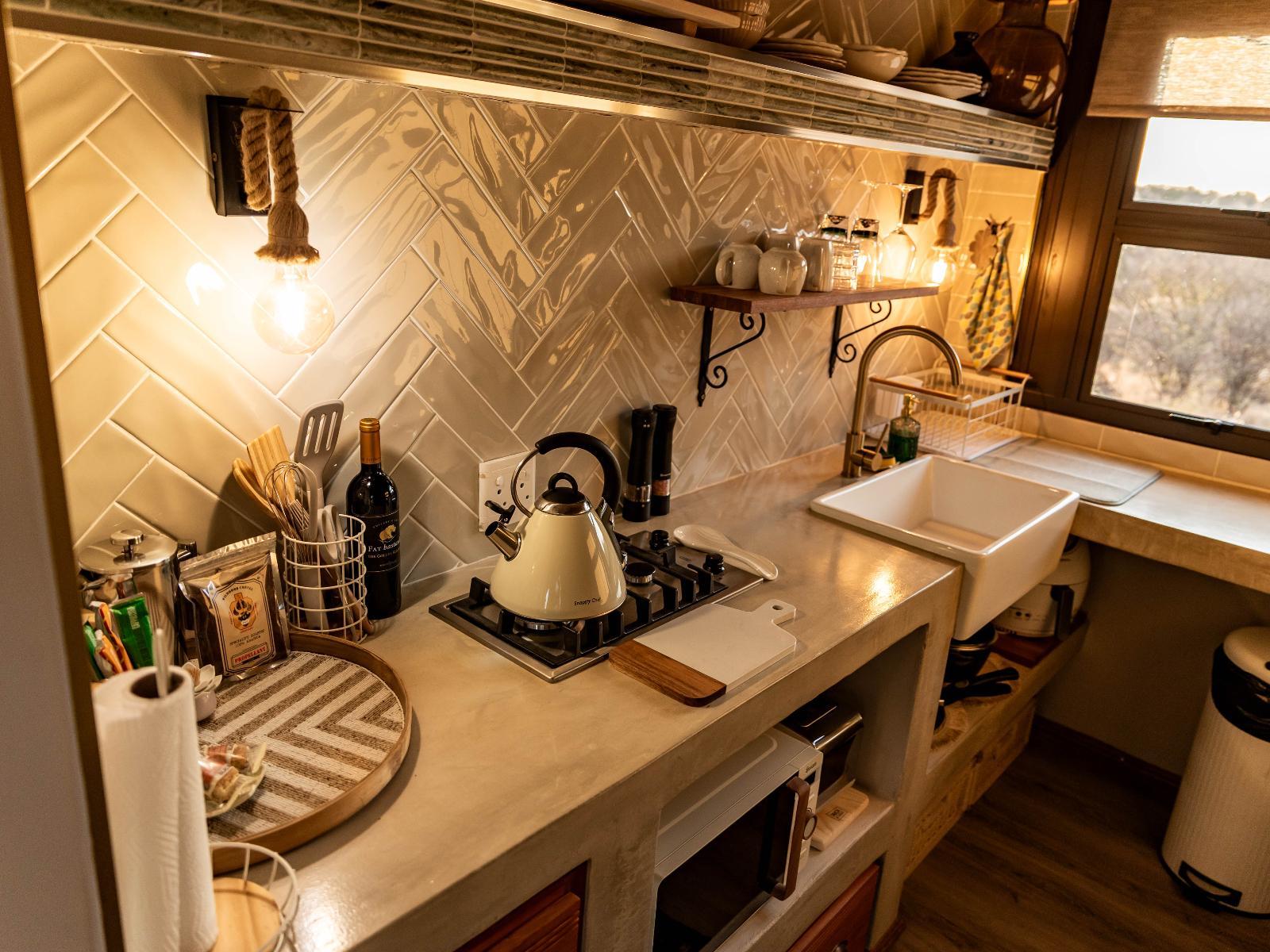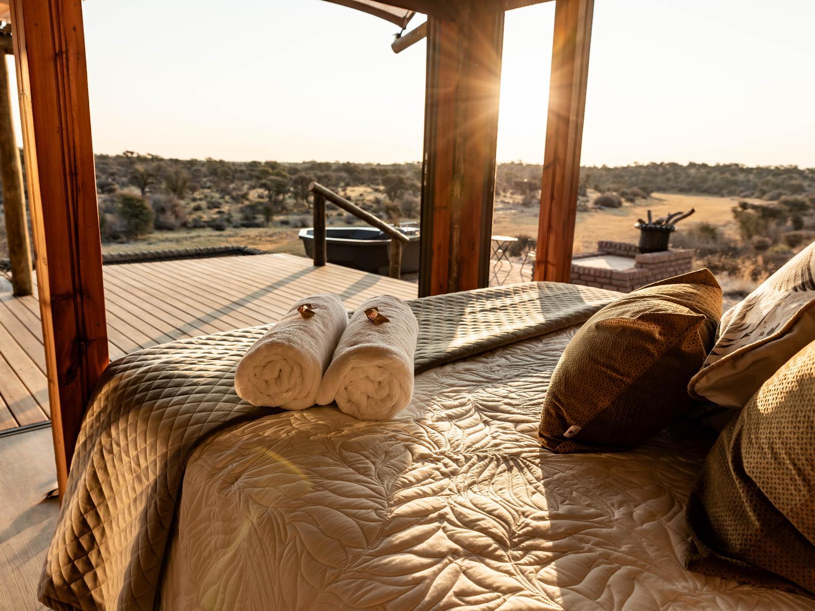 A private, self-catering luxury unit with a king bed. Open-plan bathroom with shower and bathtub, fully equipped kitchen, solar power, fireplace and water cooler. Outside deck, lounge, hot/cold tub and braai facilities. 4x4 vehicle access only.