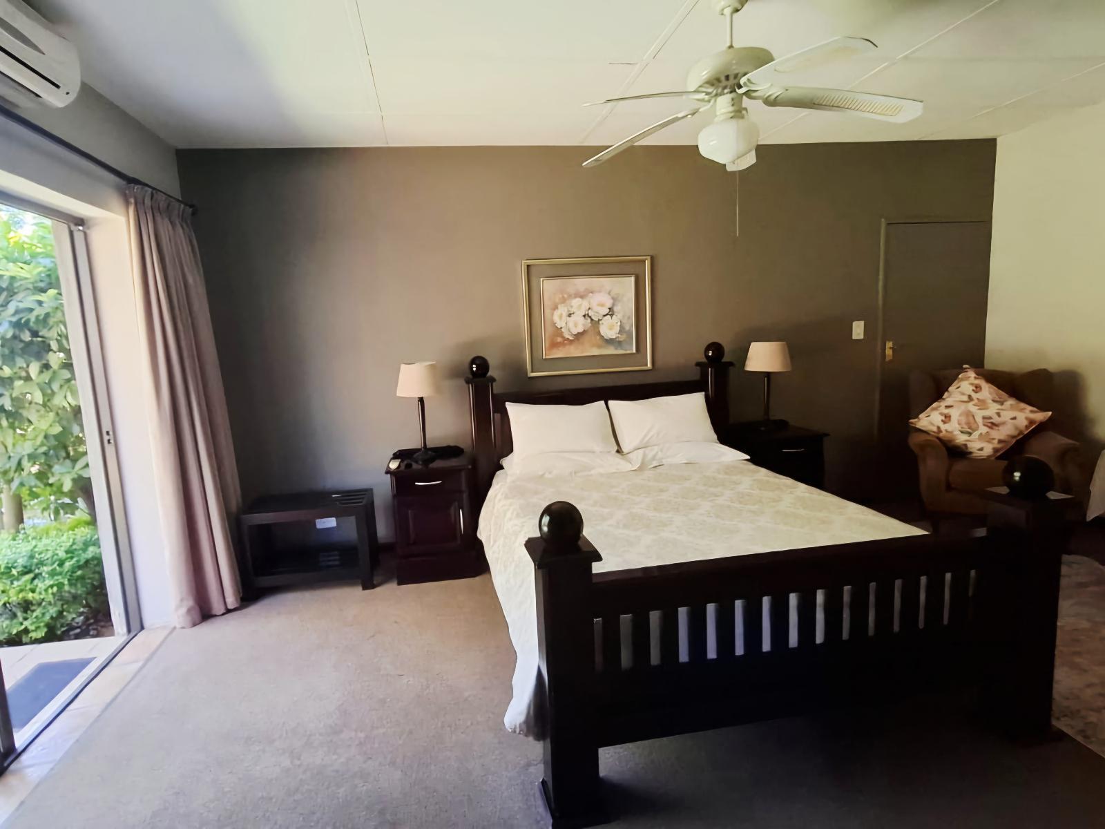 Spacious, air-conditioned room with 2 Queen beds. Separate seating area with 48" LED TV with DSTV selection, en suite bathroom with shower. Bar fridge and microwave with complimentary tea & coffee. Garden view, with private entrance through sliding door.