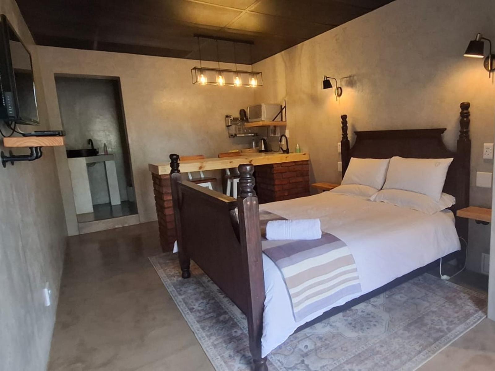 Luxury open plan unit with a queen bed, kitchenette, full bathroom, and lounge. LED television with DSTV selection, air conditioner, and private entrance through a sliding door.