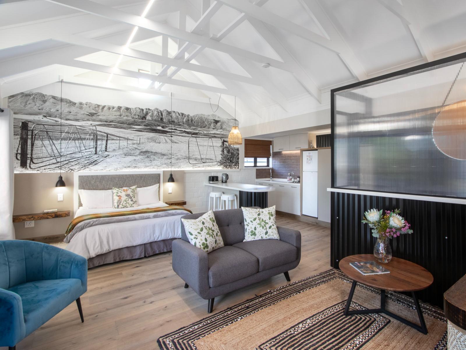 This open-plan studio is fitted with a king bed and a sleeper couch suitable for 2 kids under 13. It has a living area with a TV with DStv, a fully equipped kitchenette with a 4-plate oven/stove, and microwave, and a private quartyard with Weber BBQ.