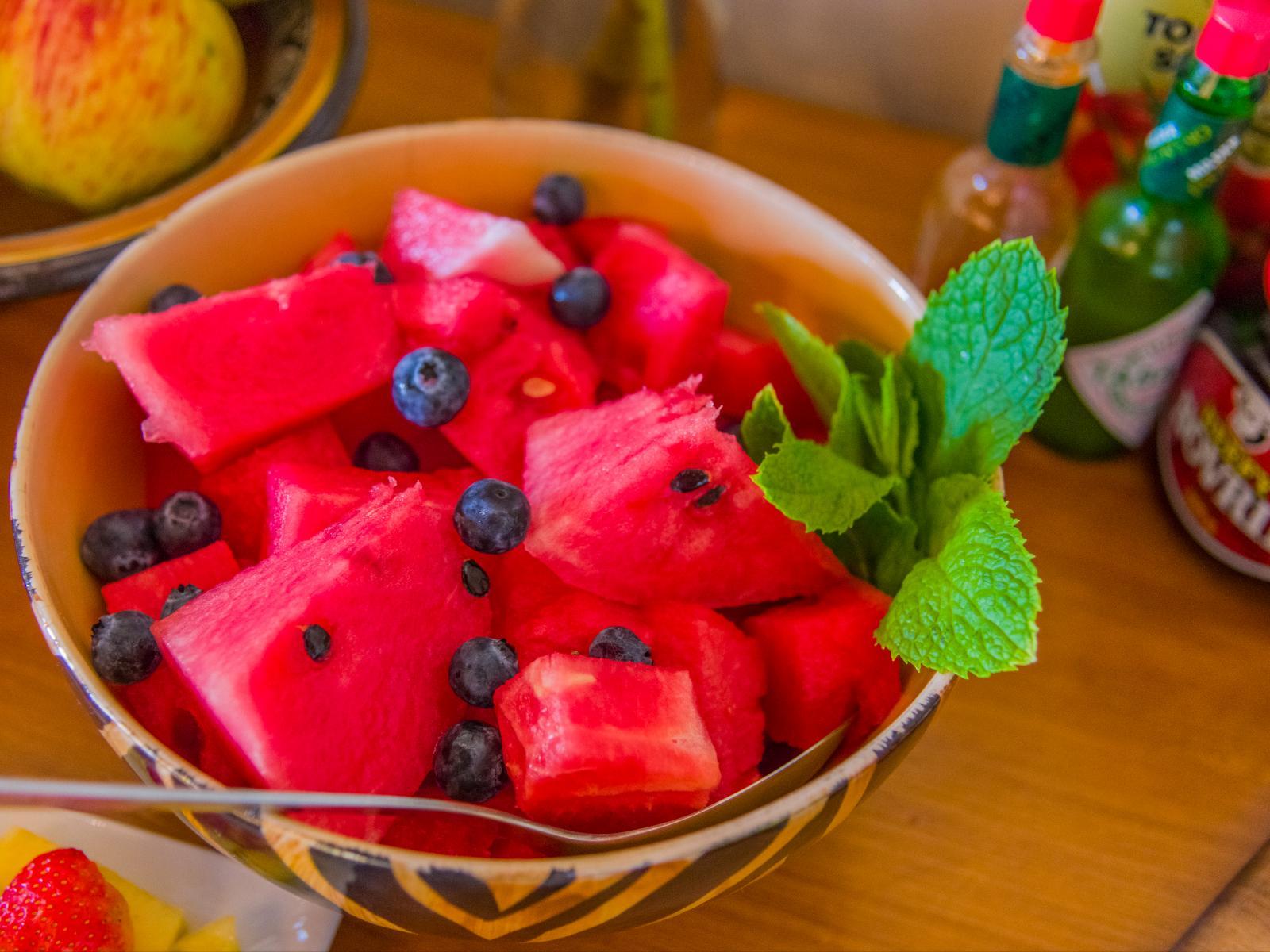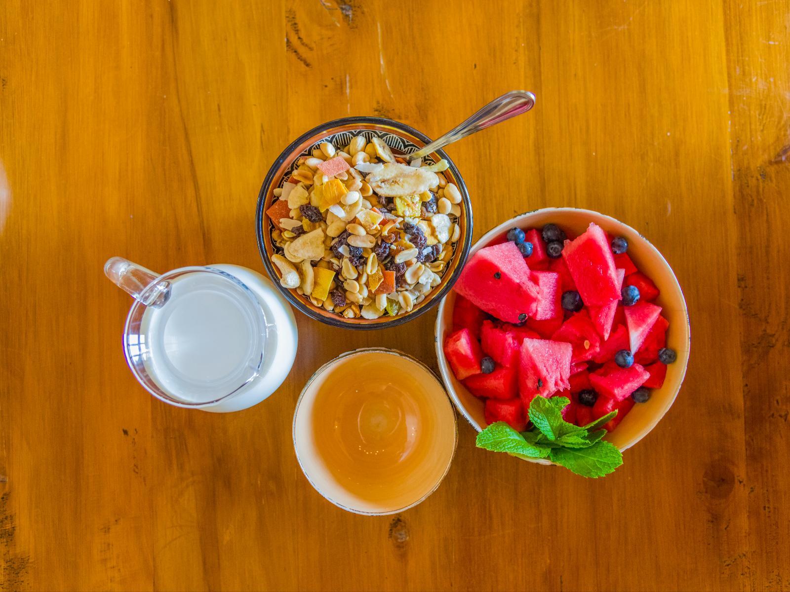 This large and airy room is located upstairs in the main lodge. It offers a king-size bed with a mosquito net canopy, an en-suite bathroom with a walk-in shower, and a private balcony overlooking the garden and vineyards