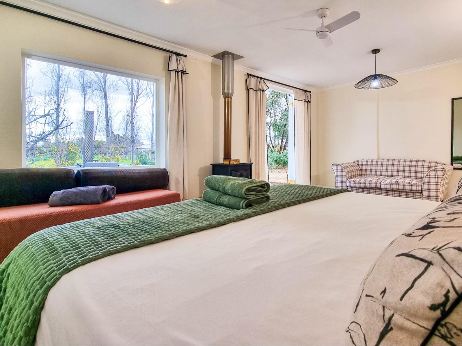 This air-conditioned wheelchair friendly unit includes a queen bed with a shower-only bathroom. It features a full kitchenette including an air fryer, 2 induction stoves and cookware, as well as an open-plan lounge and dining area.