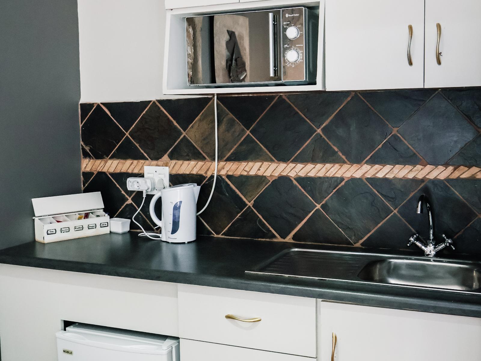 Double room with en-suite shower, air-con, heater, a Smart TV, microwave, bar fridge, and a dressing table. No smoking. Garden view from the stoep with outdoor furniture.
