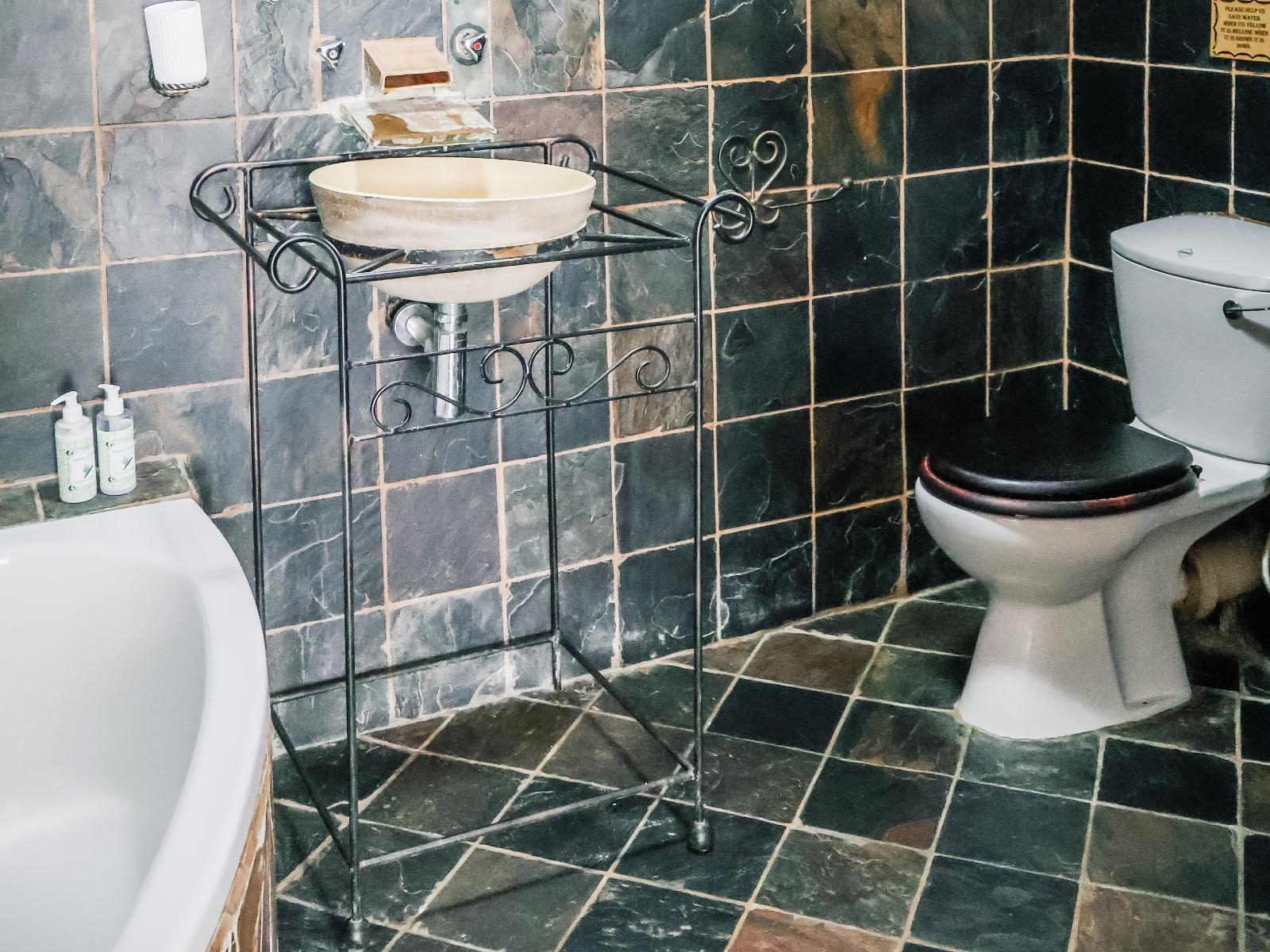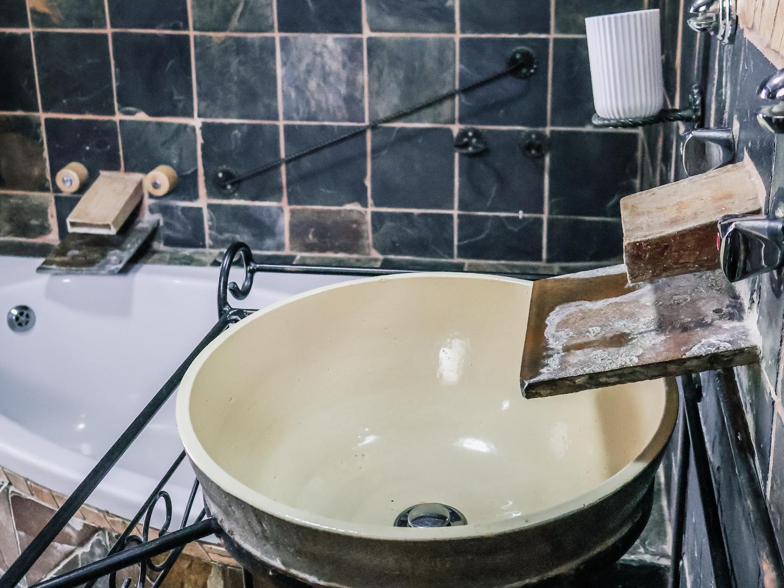 King room with an open-plan en-suite bathroom featuring both a shower and a bath. Includes air-con, heater, Smart TV, Wi-Fi, tea and coffee facilities, microwave, bar fridge, a dressing table, and a private entrance.