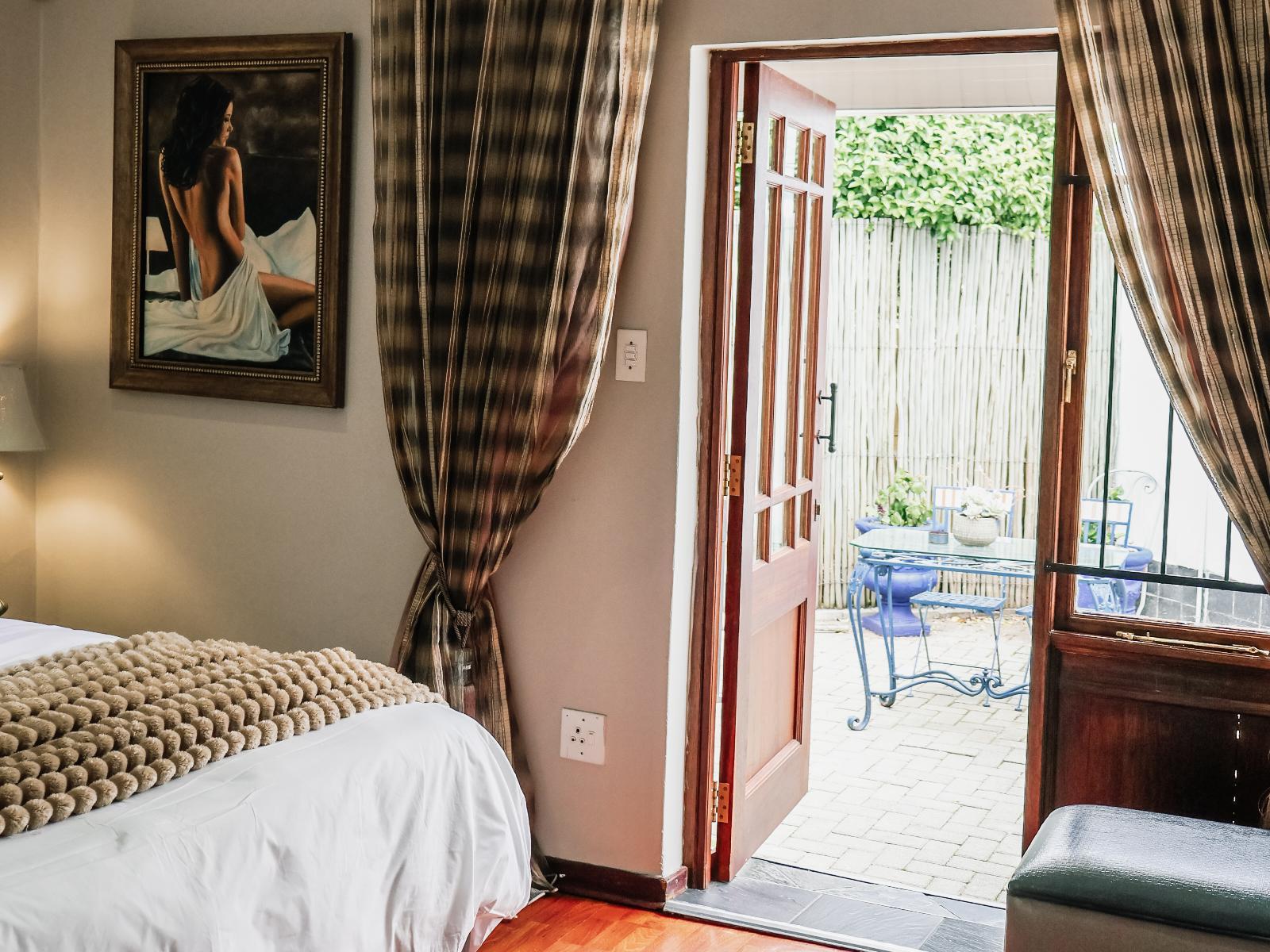A king room with an open-plan en-suite bathroom featuring a shower and bath. Includes air-conditioning, a heater, a Smart TV, a microwave, a bar fridge, a dressing table, a private entrance and a stoep with outdoor furniture.