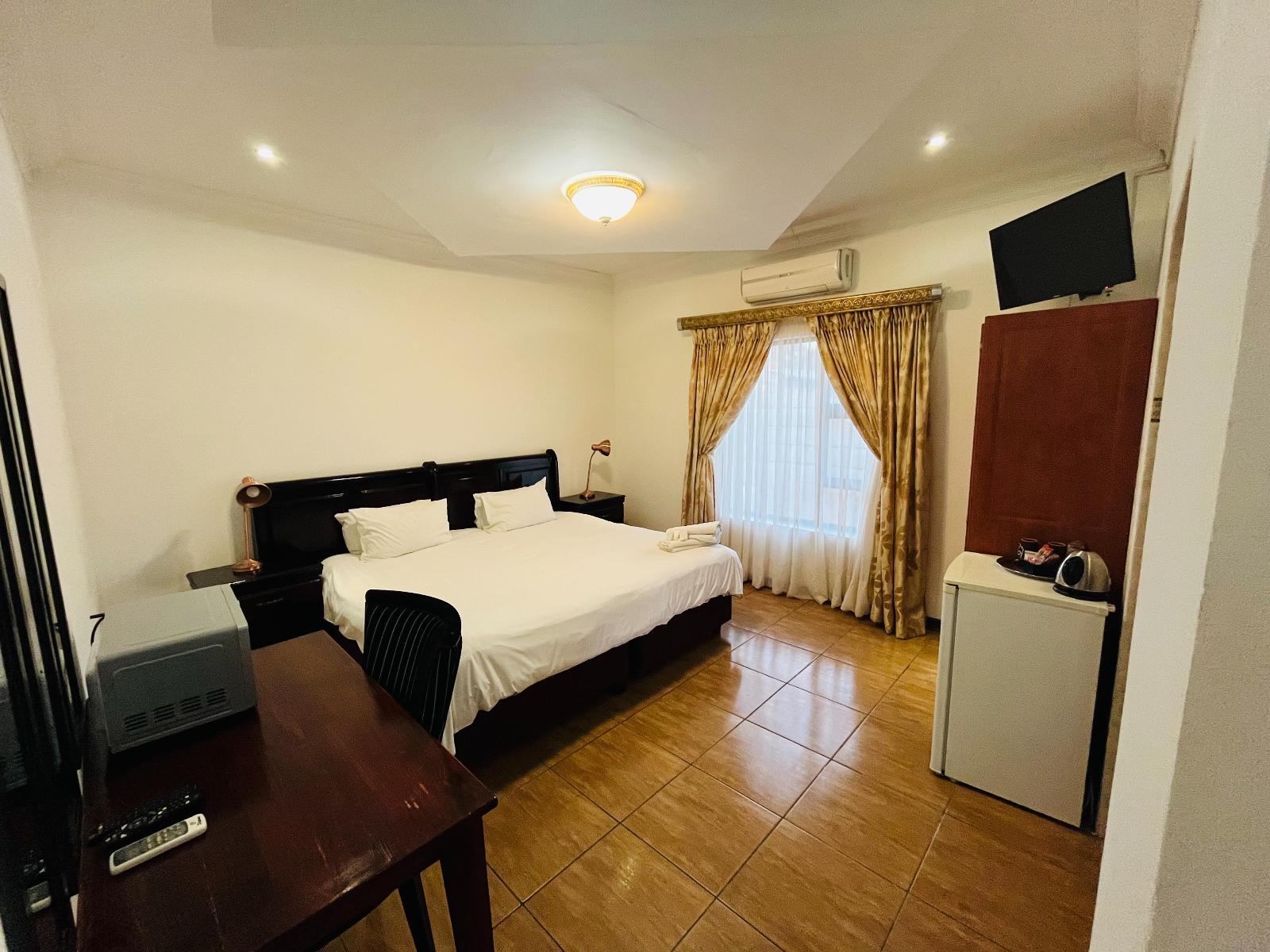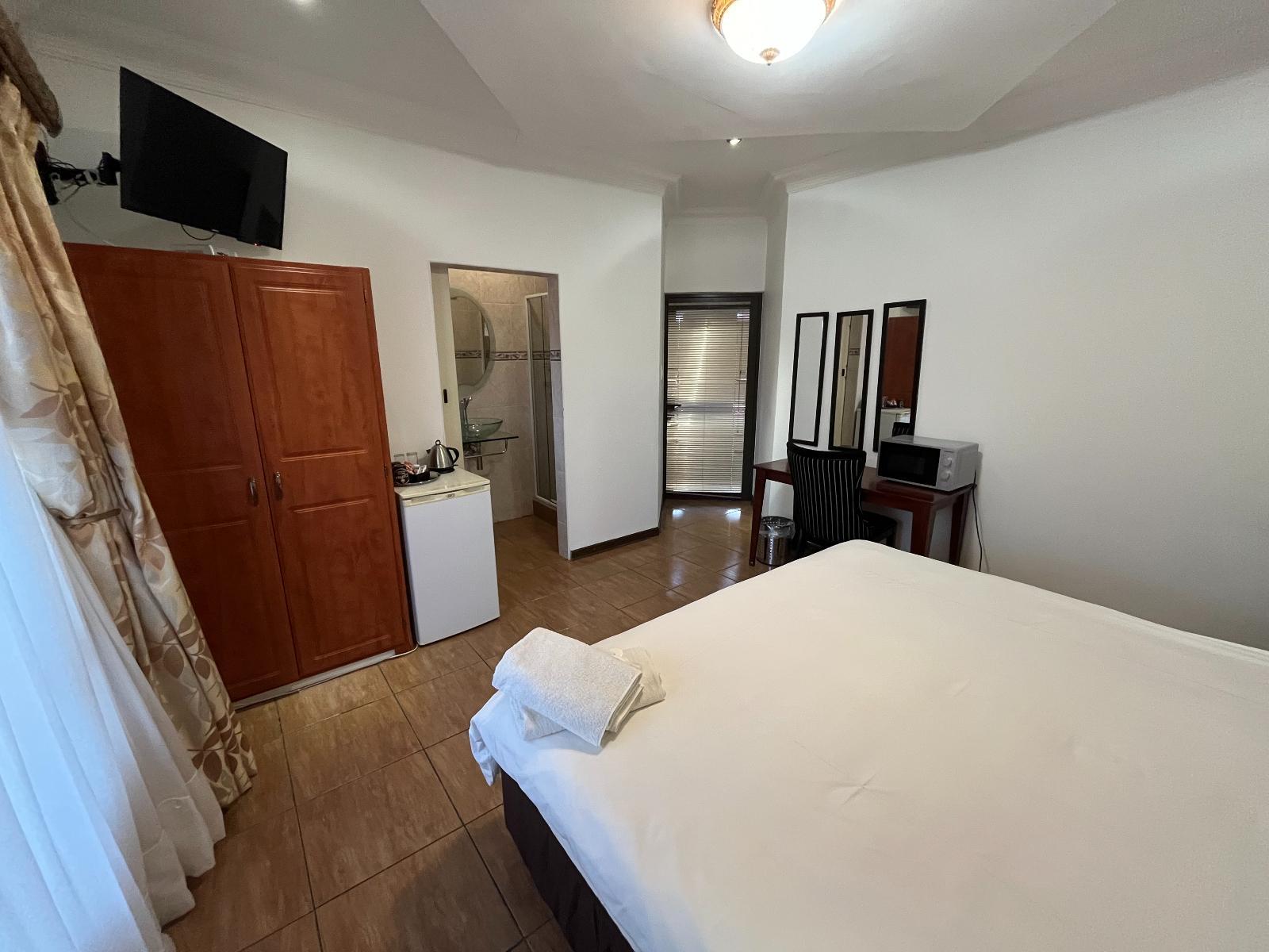 Experience a true home away from home at Leruo's Guesthouse, nestled in the heart of Kimberley. Our accommodation is thoughtfully fitted with modern amenities, ensuring a comfortable and convenient stay for both business and leisure travellers. Leruo's Guesthouse offers a selection of elegantly designed King Rooms and Queen Rooms. The King Rooms provide a luxurious king-size bed and a contemporary en-suite bathroom with a refreshing shower or a shower and a bath. Alternatively, our Queen Rooms are fitted with a comfortable queen-size bed and an en-suite bathroom featuring a relaxing bath with a convenient hand-held shower. Each en-suite bathroom is completed with a toilet and wash basin. Every room at Leruo's Guesthouse is thoughtfully equipped with your comfort in mind. You'll find air-conditioning, a bar fridge, a TV with streaming services, a microwave, a dedicated work desk, and coffee and tea-making facilities. Plus, Wi-Fi is available in all the rooms in the guesthouse, ensuring you stay connected. Guests are also welcome to enjoy our lush green garden and take a refreshing dip in the clean swimming pool.