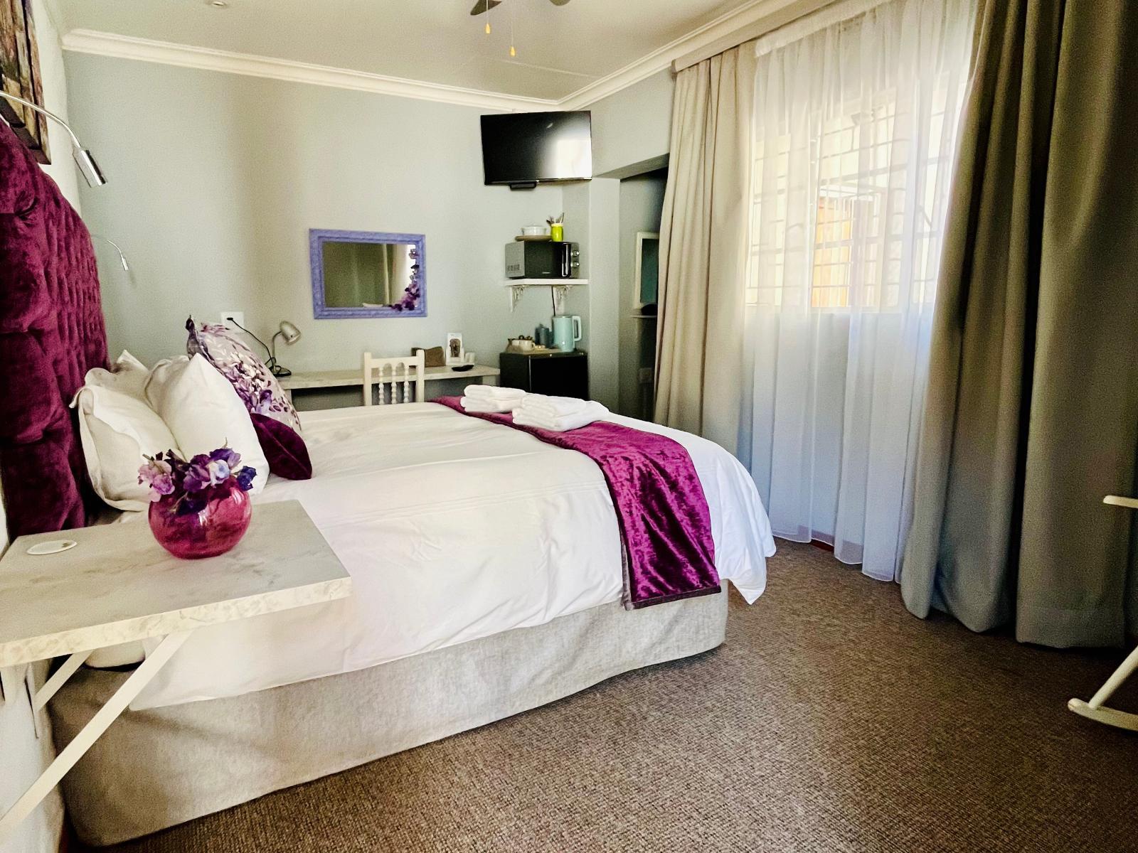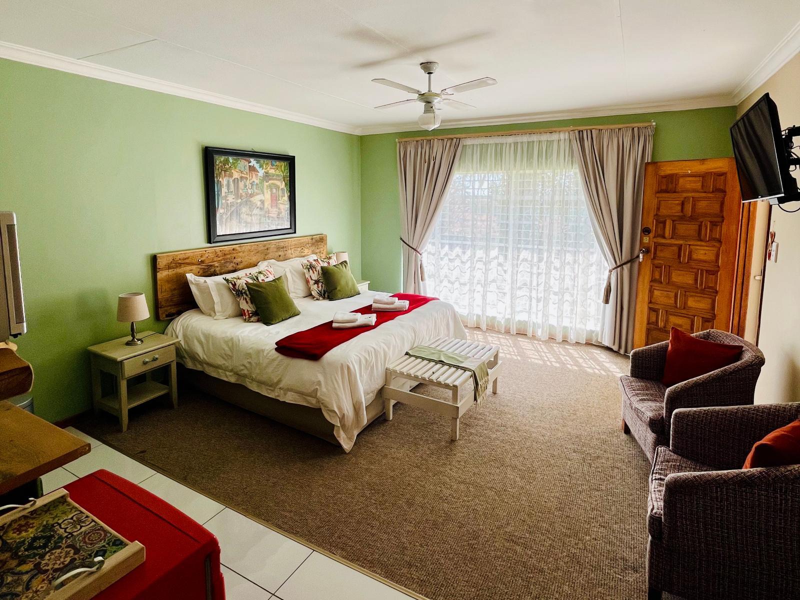 Longtom Farm Guest House is situated in the picturesque Mpumalanga, only 3 hours from Johannesburg. We are ideally situated close to popular attractions such as Dullstroom, Sabie, Graskop, Pilgrims Rest, Gods Window and en-route to the Kruger National Park. Lydenburg is also centrally located to the mining activities in the area and the guest house is situated only 3 km outside of town, offering peace and quiet for the stressed-out guest. The farm borders on two rivers, the Sterkspruit and the Swartspruit. This presents the opportunity to take a leisurely walk down to where they flow together. These two rivers also attract fish eagles and plenty of other bird life. The guest house consists of eight beautifully decorated and spacious en-suite units, each with free Wi-Fi, DStv and most have their own kitchenette, as well as one unit that is fully equipped for self-catering. Each unit has its own entrance and patio overlooking the magnificent garden and mountains surrounding the town. A number of relaxing spaces in and around the spacious garden, including a swimming pool overlooking the Longtom Pass and neighbouring game farm, add to the tranquillity of the guest house. We also provide covered parking for 8 vehicles and 2 lock-up garages.