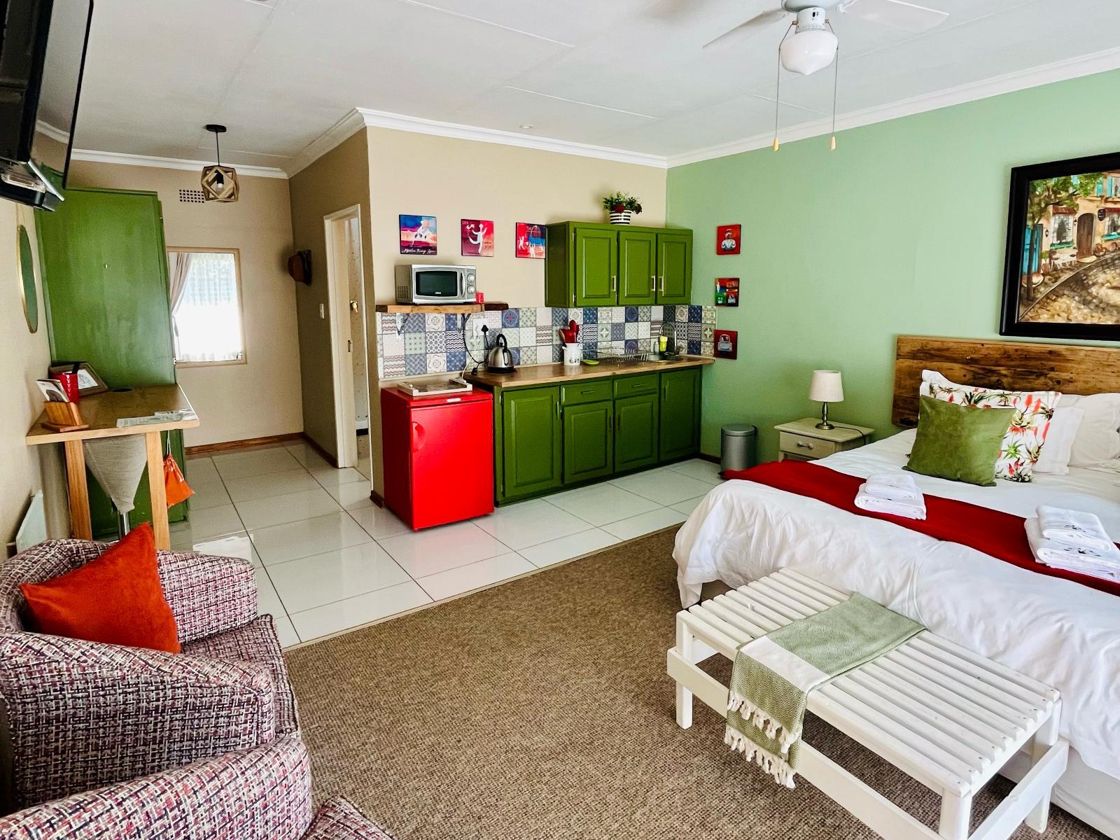 This unit has a double bed, an en-suite bathroom with bath and handheld shower attachment, and a kitchenette equipped with a bar fridge, microwave, kettle and 2-plate stove. There is a lounge area offering a relaxing space to watch TV.