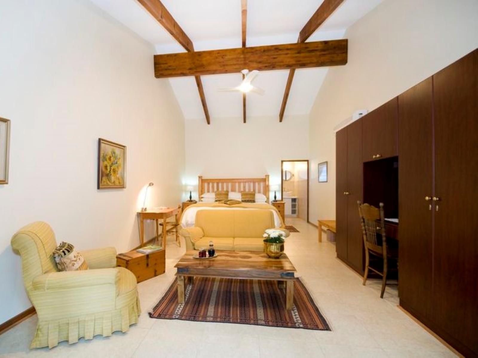 Spacious bedroom with extra-length, extra-super king bed or two, three-quarter beds. Additional juvenile bed for child up to +/-8y.Full en-suite bathroom with bath and double walk-in shower with built-in benches. Comfortable lounge area and covered patio.