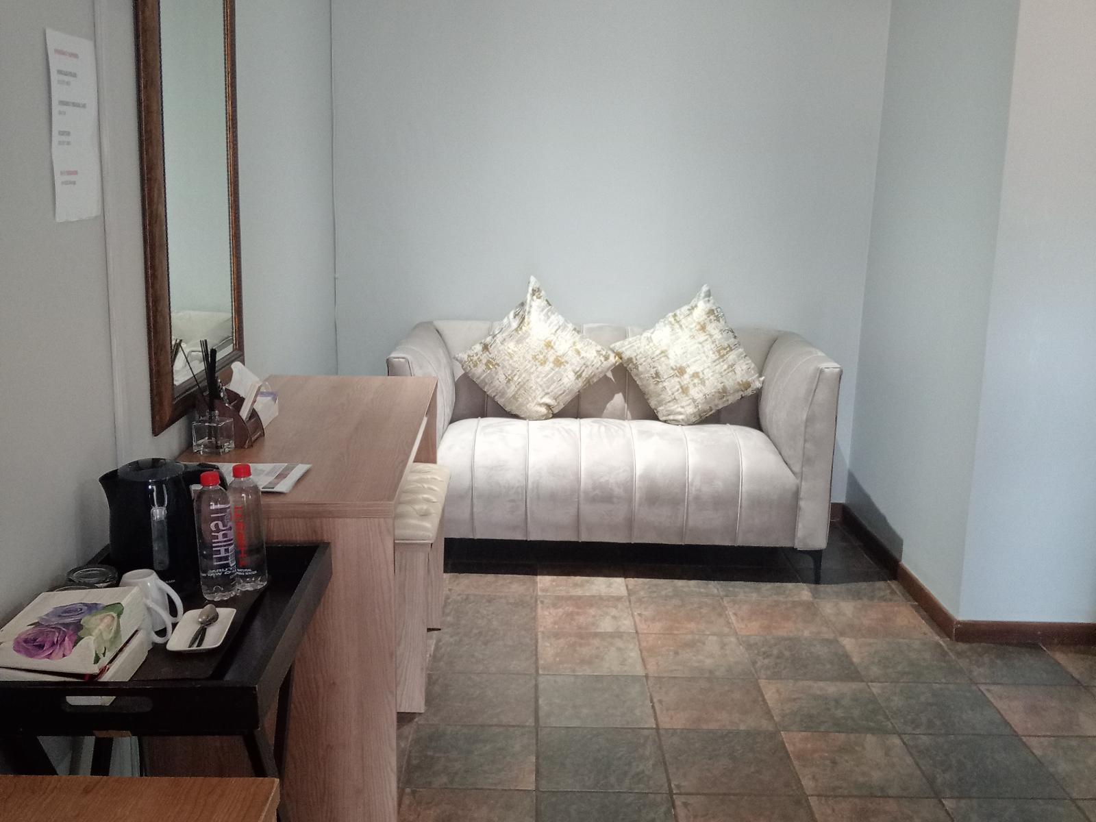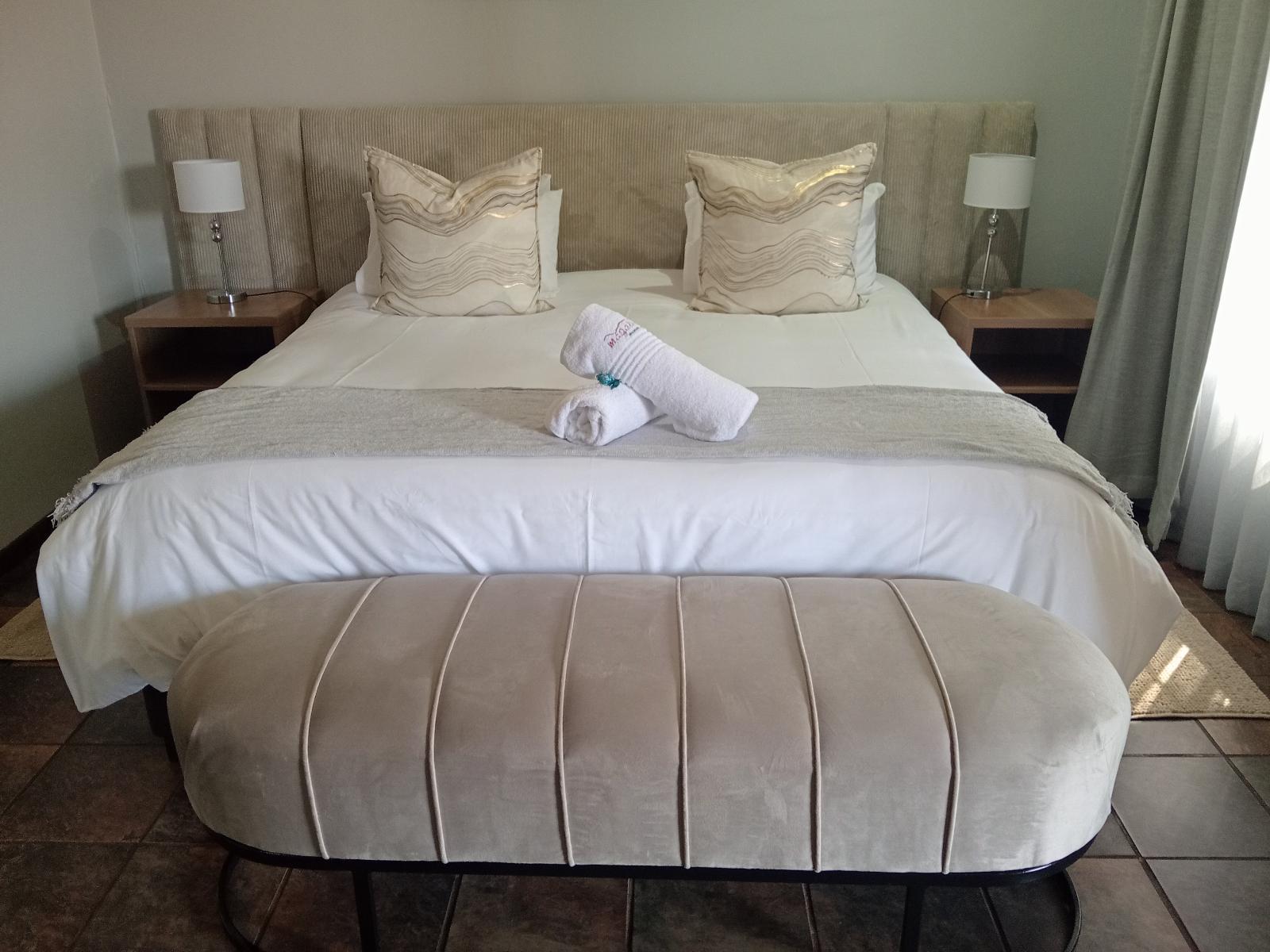 This air-conditioned room has a king-size bed, an en-suite bathroom with a shower, and a seating area. The room features a flat-screen TV with DStv, a tea and coffee station, and wireless internet access.