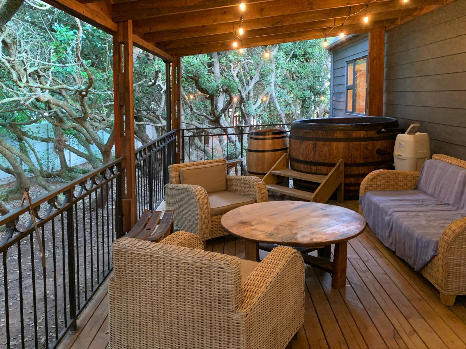 Magical Cabin in the Woods is a charming self-catering cabin nestled between the trees in a small Milkwood forest in Van Dyksbaai, Kleinbaai. This vacation home is 700 m from the Van Dyk's Bay harbour where the boats launch for sea tours and shark cage diving. This beautifully crafted timber home is generous and spacious with large indoor spaces and a huge outside deck to enjoy summer days and nights. There is a large master bedroom with an en-suite and a spacious loft which acts as a second bedroom where up to 5 people can sleep. Everything is generous and open plan and very much built around the Milk Wood forest and the sun's position. The open trusses in the lounge and well-equipped kitchen area offer drama and a sense of space as they tower 7m from the floor to the nock. It is great as a romantic getaway or for families wanting to break away. You can hear the sea as it is less than 700m from the house. Let's not forget our furry friends, our home is a rare pet-friendly getaway - just be aware that there are snakes on the property from time to time, as well as tortoises and owls.