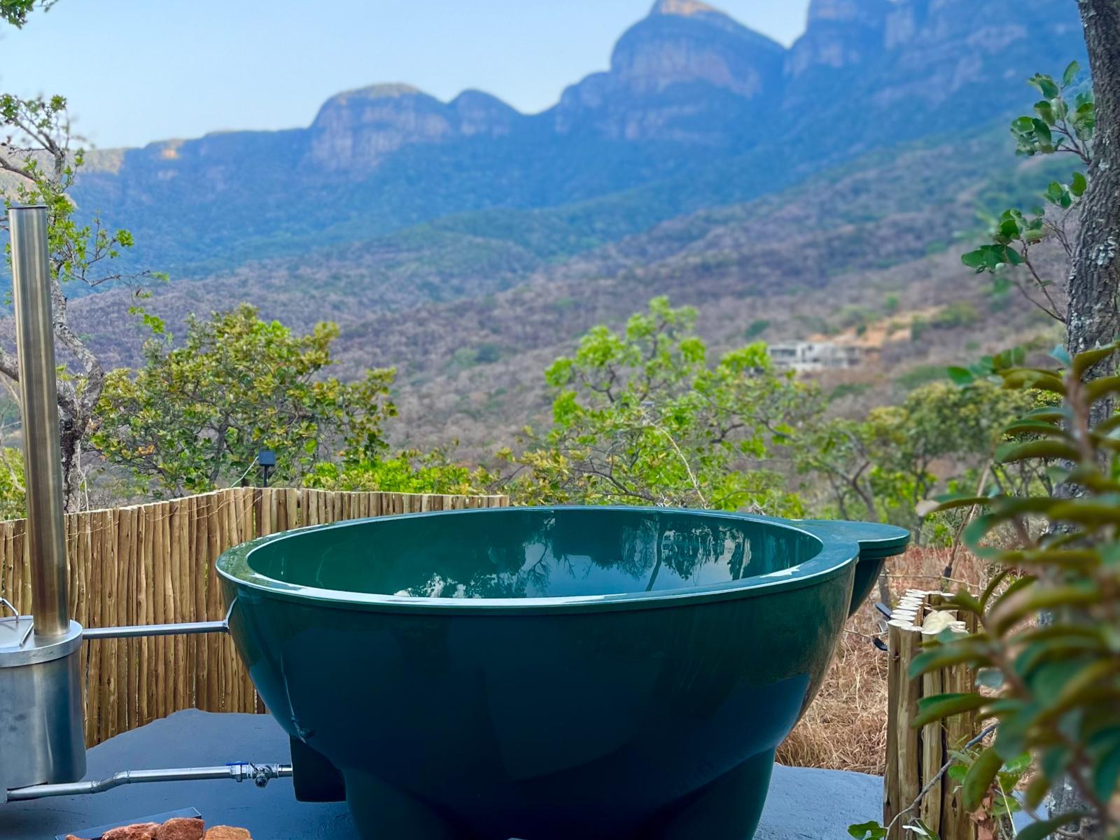 With unrivalled views of the majestic Northern Drakensberg and Mariepskop, the two luxurious private villas of Marepe Mountain View are the ultimate peaceful place to unwind. Marepe Mountain View offers two eco-friendly villas, completely off the grid but still with exceptional luxury, from an outdoor walk-in shower to a fully equipped kitchen and outside braai area with a PizzaBraai. Each villa features a lavish king-size extra-length bed with Egyptian cotton linen, hypoallergenic pillows and duvets, air-conditioning and a fan, a mosquito net, and an en-suite bathroom with a walk-in shower, bath, hair dryer, gown, slippers and double sink. Pangolin Villa also has a private hot tub for those romantic evenings. Each villa has a private safe, Nespresso© coffee machine, convection microwave, gas stove, fridge, and all necessary kitchen supplies. The villas also boast a private plunge pool each with lounge beds, a spacious sundeck, high-speed Wi-Fi, and a TV with Netflix and DStv. Yoga mats and daily cleaning services are available for your convenience. Enjoy this unique hideaway in nature, close to Blyde River Canyon. The 3-metre tall and 7.5-metre wide windows offer an exceptional view of the Mariepskop mountain and Northern Drakensberg. Taking the concept of a room with a view to the next level!