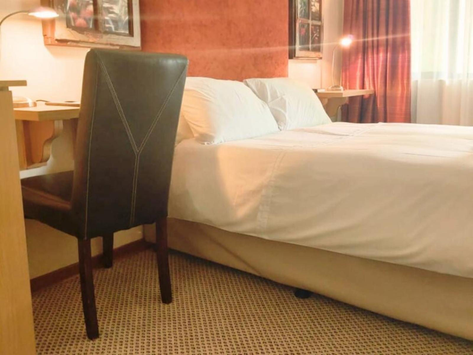 The comfort double room features a double bed, an en-suite bathroom, a flat-screen TV, free Wi-Fi, a bar fridge, a coffee/tea station, and water. It also features a desk, elegant decor, a natural-light luggage rack, and essential amenities.