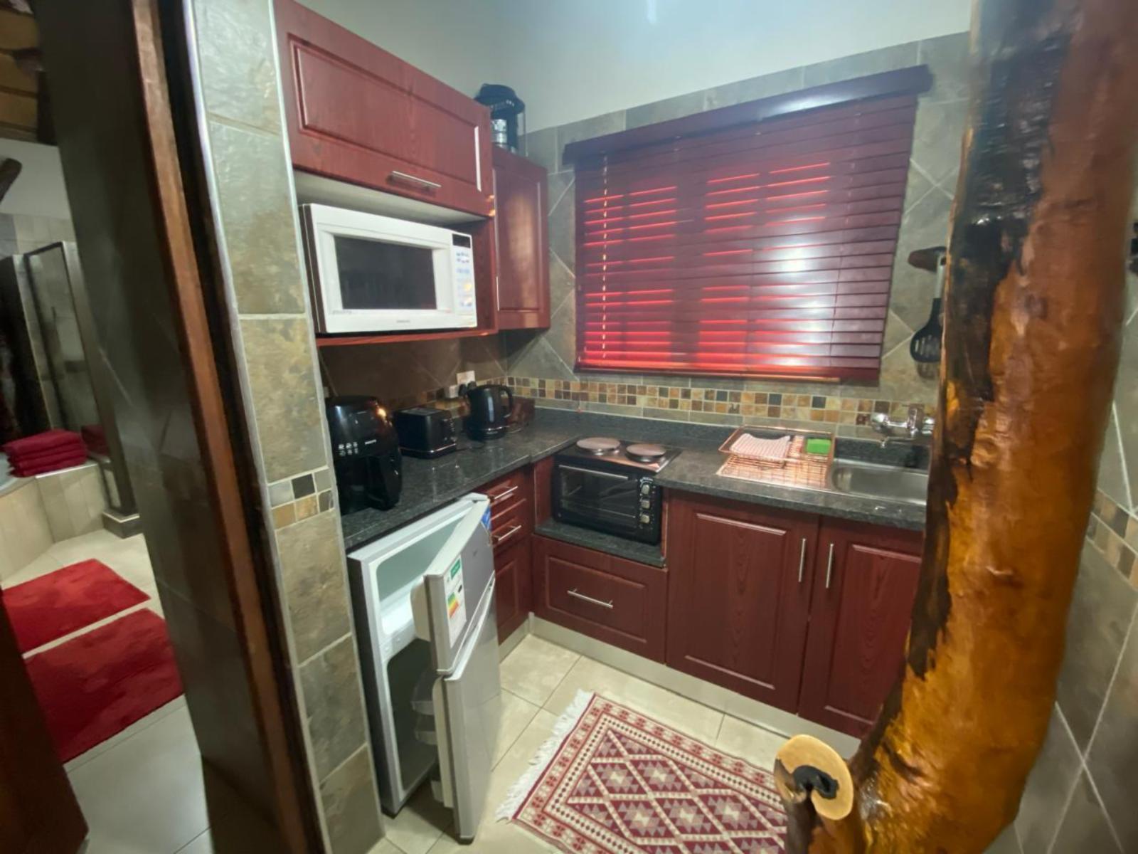 This chalet features a king-size bed, two single beds, and a full bathroom with a bath and shower. The kitchen is equipped with a two-plate stove, oven, bar fridge, microwave, and air fryer. Enjoy meals at the indoor dining area or have an outdoor braai.