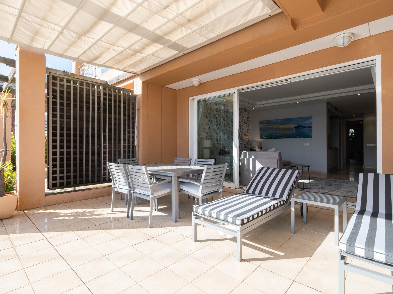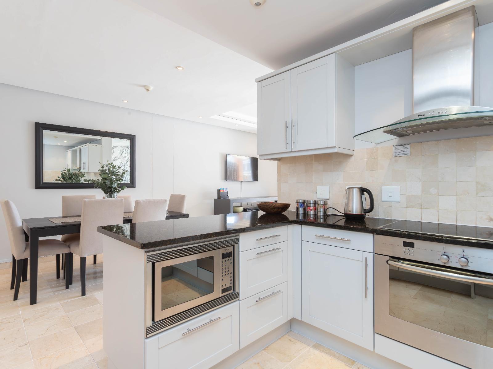 Luxurious 2-bedroom apartment with breathtaking canal and Table Mountain views. Main en-suite with shower, second bathroom with bath and shower. Stylish lounge, dining for 6, fully equipped kitchen, large terrace, double-glazed windows.